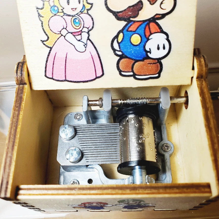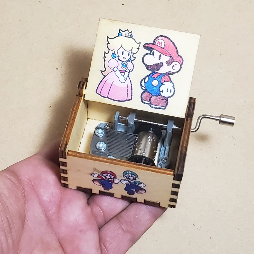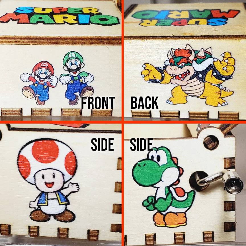 New. Music box and Keychains. Music box: Wooden music box with colorful images Mario, his girl Peach, his boy Luigi, Toad, Yoshi, and the baddy Bowser. Also the Super Mario logo itself. When you turn the crank it plays a music box adaptation of the Super Mario Bros. 8-bit theme song from the first Super Mario Bros. game ever for the Nintendo. Very retro! Music box measures 2.5 inches x 2 inches x 1.5 inches Keychains: Rubber Mario and Luigi keychains. Measure 1 - 1.5 inches each. π More Mario and other game room merch available. Check out my other listings! π