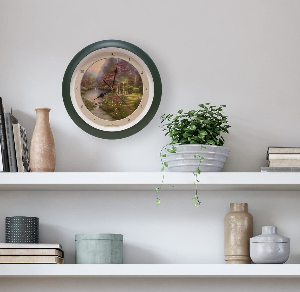 Clock features peaceful “The Garden of Prayer” illustration by Thomas Kinkade that invites the observer to enter a beautiful garden – a quite meeting place to speak to their creator. To add ambiance, each hour is announced by one-of-three soothing nature sounds. Light sensor deactivates sounds when room is dark. Officially licensed by Thomas Kinkade Studios Each hour the clock plays one of three soothing nature sounds Light sensor will automatically turn off sounds when the room is dark Clock measures 13" in diameter and has a keyhole on the back for easy hanging on any wall Requires 3 AA batteries (not included)