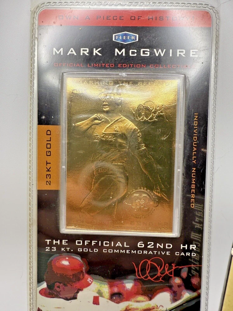 đ„ Dive into baseball history with this incredible Mark McGwire Fan Collection featuring rare, iconic cards from throughout McGwireâs legendary career. Whether youâre a die-hard fan or a collector, this set is the perfect treasure trove for your collection. What's Included: A variety of premium McGwire baseball cards from brands like Topps, Fleer, Pinnacle , and more. limited-edition 23kt Gold Card commemorating Mark McGwire's historic 62nd home run. Individually numbered and encased. Cards spanning McGwire's Aâs and Cardinals era , including highlights from his record-breaking 1998 season . A mix of glossy and traditional styles showcasing iconic moments of his career. Why This Collection? đ Collectorâs Dream: A unique opportunity to own a piece of baseball history. đ Perfect Gift: Ideal for the ultimate McGwire fan or anyone who appreciates the golden age of baseball. ⟠Diverse Selection: Features an array of designs, team uniforms, and career milestones. Add this incredible Mark McGwire collection to your lineup today and relive the excitement of one of baseball's most memorable players! đ„