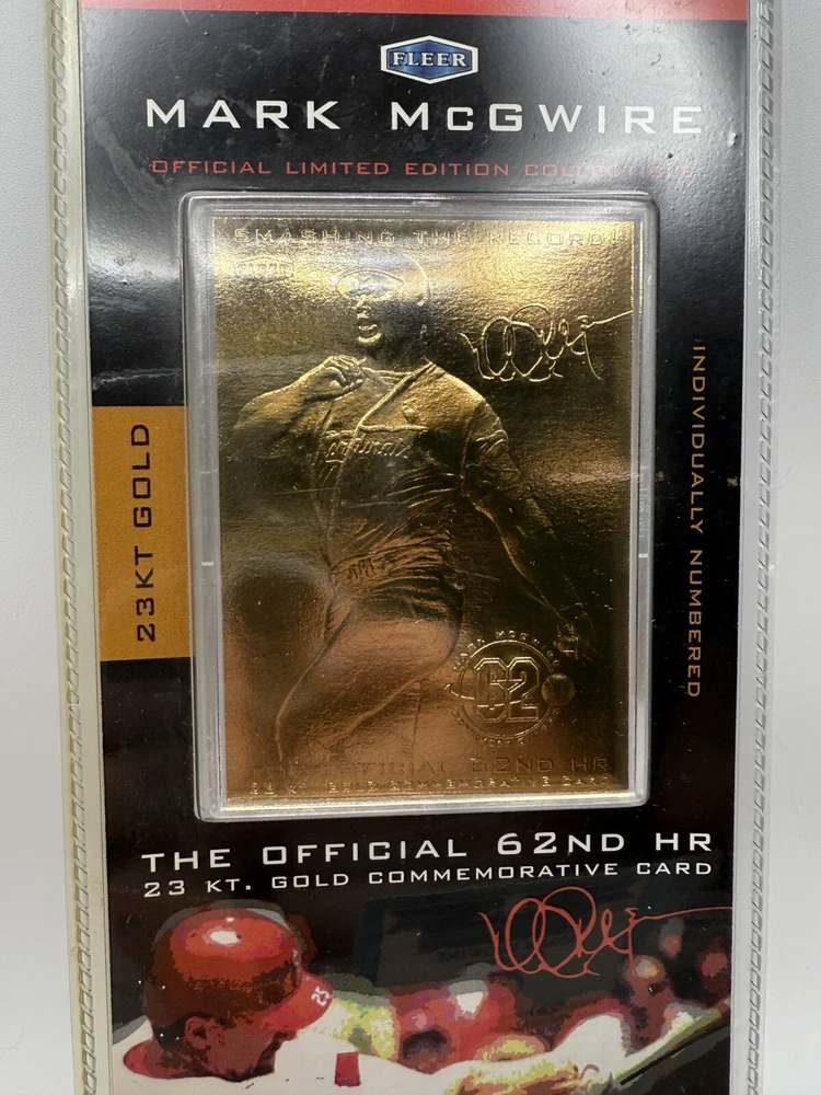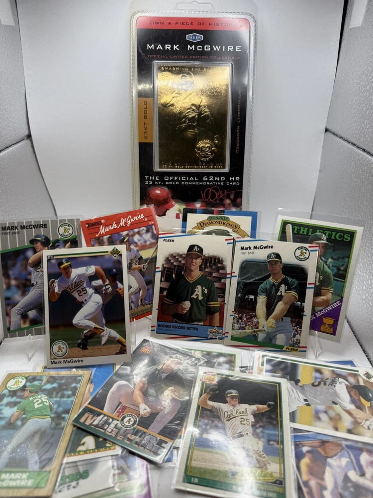 ⚾ Own a Piece of Baseball History! ⚾ This amazing Mark McGwire collectible lot is a must-have for any baseball fan or card collector. Featuring a stunning 23kt gold commemorative card and a variety of vintage baseball cards, this set captures the legendary career of one of MLB’s greatest sluggers. Included in This Lot: ✨ Official 23kt Gold Card – Limited Edition commemorating McGwire's record-breaking 62nd home run. Individually numbered and encased in original packaging. ✨ Assorted Baseball Cards – A mix of iconic Mark McGwire cards from brands like Topps, Fleer, Donruss, and Upper Deck. Includes rookie cards, highlights, and team memorabilia. 💡 Highlights: Great for collectors or as a gift for a sports enthusiast! A fantastic way to celebrate McGwire's legendary career with the Oakland Athletics.