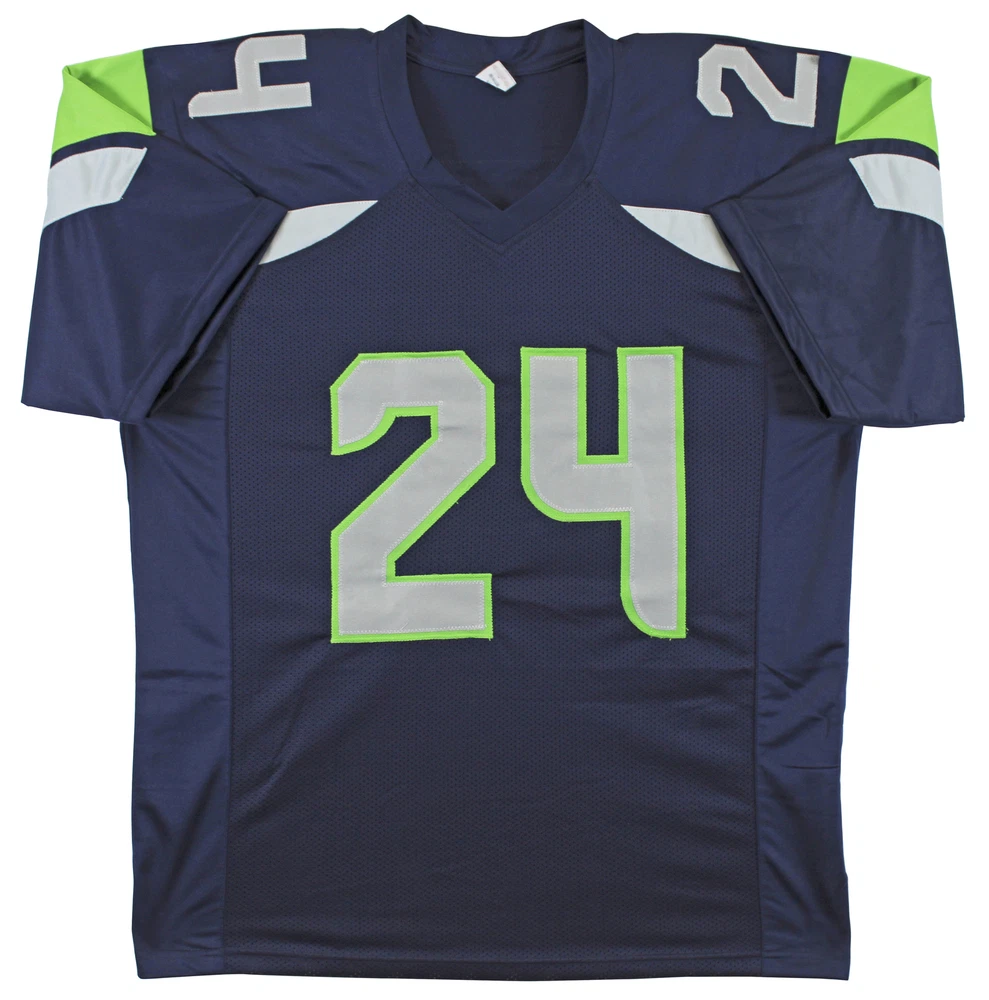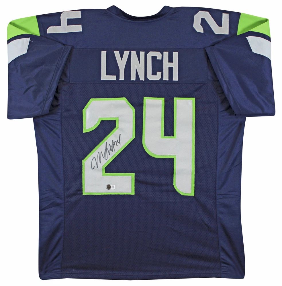Press Pass Collectibles Football Trading Cards Photographs Framed Photographs Footballs Jerseys Framed Jerseys Game Used Helmets Mini Helmets Index Cards Lithographs Magazines Other Baseball Trading Cards Photographs Framed Photographs Baseballs Bats Jerseys Game Used Helmets Index Cards Lithographs Magazines Other Basketball Trading Cards Photographs Framed Photographs Jerseys Framed Jerseys Basketballs Game Used Floors Index Cards Magazines Other Hockey Trading Cards Photographs Jerseys Framed Jerseys Game Used Hockey Sticks Pucks Index Cards Magazines Other Boxing Photographs Framed Photographs Gloves Trunks Other Golf Photographs Balls Flags Index Cards Other Misc Sports MMA Olympic Racing Soccer Tennis Wrestling Other Celebrity Photographs Framed Photographs Books Magazines Posters Other Music Photographs Framed Photographs Performance Used Albums CDs Drum Heads Drum Sticks Guitar Posters Programs Other Historical Photographs Documents Military Space Other Presidential Photographs Baseballs Books Documents Magazines Other All Inventory 294.99 This Autographed Navy Blue Pro Style Jersey has been Personally Signed by Marshawn Lynch of the Seattle Seahawks. This item is 100% Authentic to include a Certificate of Authenticity (COA) / hologram by Beckett Authentication Services. We have multiples of this same item. While the photographs are representative of this item, the size, placement and strength of the signature may vary. Each item is hand signed, therefore, each autograph is unique. This is a X-Large sized, non-branded, custom-stitched Jersey. Product Details Signed By: Marshawn Lynch Additional Info: Seattle Seahawks Authenticated By: Beckett Details: The PPC Guarantee: Press Pass Collectibles (PPC) offers authentic in-person autographs that include a 100% money-back lifetime guarantee regarding the autograph's authenticity. Our items are sourced from PPC autograph signings or direct from leading suppliers of authentic memorabilia. The companies that authenticate these items include Beckett Authentication Services (BAS), Professional Sports Authenticator (PSA/DNA), James Spence Authentication (JSA), Steiner Sports, Upper Deck, Fanatics, Mounted Memories, and Tri-Star Productions. All autographed items come with a Certificate of Authenticity (COA) from these suppliers that includes a tamper proof hologram affixed to the item. Shipping: Press Pass Collectibles ships all orders via UPS, FedEx, or USPS within 24 business hours. We will combine shipping ! Additional items are typically $1 - $2 each, but cost may vary depending on dimensions and weight. Please contact us for a combined invoice prior to making your paymen t. PPC Exclusives: Press Pass Collectibles has exclusive autograph relationships with over 50 professional athletes and celebrities including Magic Johnson, Chevy Chase, Travis Kelce, DK Metcalf, Justin Jefferson, Randy Moss, Kyler Murray, Adrian Peterson, Baker Mayfield, Ray Lewis, George Kittle, Dak Prescott, Jerome Bettis, Chase Claypool, Deion Sanders, Jack Lambert, Mean Joe Greene, T.J. Watt, J.J. Watt, Tony Dorsett, Devin White, Tony Gonzalez, Emmitt Smith, Michael Irvin, Jason Witten, Jared Allen, Kurt Warner and more! Shop our entire collection