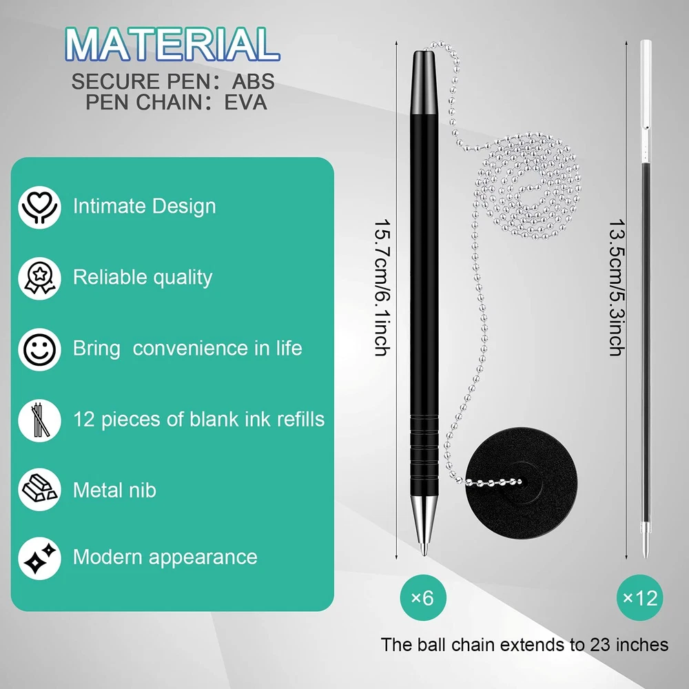 Features: Classic black ink can be applied to writing most documents with long-lasting, safe and reliable, with good texture, the ink able to dry quickly, and you'll love to hold the pens as they touch comfortably in your hand. These security pens are easy to refill with black ink when the ink runs out, and the pens come with reliable, quality black ink that dries quickly. You and people around you can use these pens at ease. Specifications: Material: metal Color: black Sizes: Secure pen: 5.8 inches in length Refill: 5.3 inches in length Pen safety chain: 23 inches in length Package includes: 6 x Secure pens 12 x Pen refills Notes: Manual measurement, please allow slight errors in size. The color may exist slight difference due to different screen displays. Complete set: the package comes with 6 pieces of secure pens with pen chains and security pen holders, also includes 12 pieces blank ink refills, a chain and a pen holder for each pen, a total of 18 pieces; The quantity is enough and convenient for your daily study or work needs Quick to dry black ink: the classic black ink of these pens with chains is long-lasting, safe for human body, with nice texture and can dry quickly, so you can use them to writ most documents, such as composition, notes, diaries, etc.; In addition, these black safety pens are comfortable to hold and write, making you fall in love with writing Make the work go smoothly: the secure pens with chains can stay fixed and standing, just reach out your hand and quickly pick it to use at anytime and and anywhere, making your workday smoother; It may be a little inconvenience but losing your pen several times a day may to a bad mood; These security pens will make the day run smoothly Chain size: the pen safety chain can extend to 23 inches, long enough to fit on most desk tops; The round black pen holders can stick firmly to smooth surfaces and won't come off easily, so you can use them with confidence Wide applications: the counter pens with chains are suitable for office, study, reception desk, hospital, school, bank or other occasions of daily use, etc.; Thanks to the strong adhesive holders, these pens will stick to the counters and will not move; These pens can be shared with everyone, but they will stay with you forever