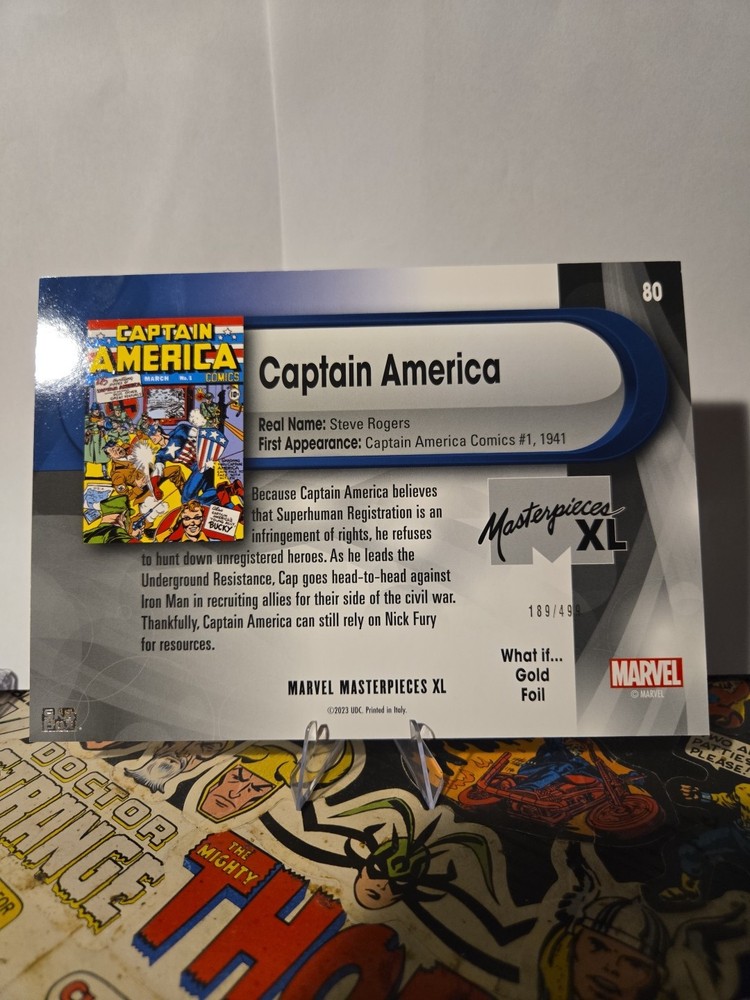 Marvel Masterpieces XL Captain America What If.....Gold Foil #'d 189/499. Perfect condition with no damage whatsoever.