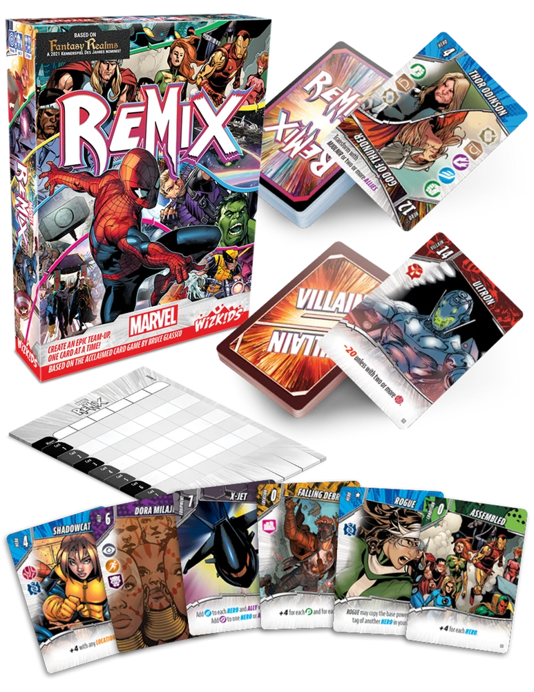 Wizkids/Neca Marvel Remix Players: 2-6 Playtime: 20 Age: 12+ Designer: Bruce Glassco Publishers: WizKids (I) Mechanics: Open Drafting, Set Collection Category: Card Game Create an epic battle with a hand of cards in Marvel: Remix, based on the acclaimed hit game Fantasy Realms! Marvel: Remix is based on the critically--acclaimed game Fantasy Realms, also by Bruce Glassco, which was nominated for the 2021 Kennerspiel des Jahres! Through Marvel: Remix’s intuitive gameplay, you’ll build a team of iconic heroes and allies, arm them with powerful equipment and maneuvers, and visit familiar locations, all while taking on infamous villains! Players are dealt a hand of seven cards representing characters, items, or places from throughout the Marvel Universe. Each turn, you’ll draw from the Hero deck, the Villain deck, or the cards discarded by your opponents, before discarding a card yourself. Cards have a base value, and a bonus that changes based on the other cards in your hand. Whoever has the hand worth the most points at the end of the game is the winner! - Collect iconic heroes, villains, and more! - Discover epic combinations! - Create the most powerful hand of cards! - Get ready for an epic Super Hero Battle! Contains: 61 Remix Cards 18 Villain Cards 1 Score Pad 1 Rulebook