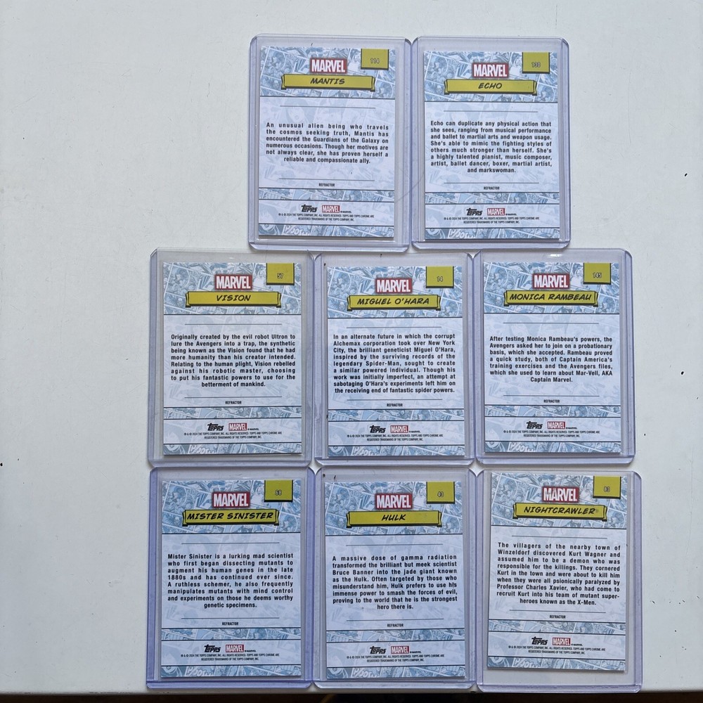 This bundle includes 8 cards from the Marvel Topps Chrome Refractor set. The cards feature various characters from the Marvel Cinematic Universe and are authenticated by Topps. The card quality is near mint or better and they are ungraded. These non-sport trading cards are perfect for collectors and fans of the Marvel franchise. The cards are a great addition to any collection and are sure to impress. Don't miss out on this opportunity to own a piece of the Marvel universe.