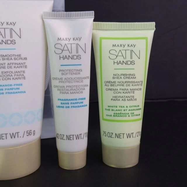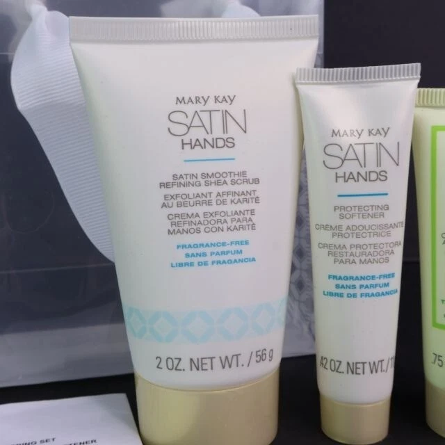 Up for your consideration is a Mary Kay bag with mini bottles of Satin Hands: - Satin Smooth Refining Shea Scrub (2oz) Fragrance Free - Nourishing She Cream White Tea & Citrus (.75oz) - Protecting Softener (.42oz) Fragrance Free Never used and the plastic bag with ribbon is also in good condition.