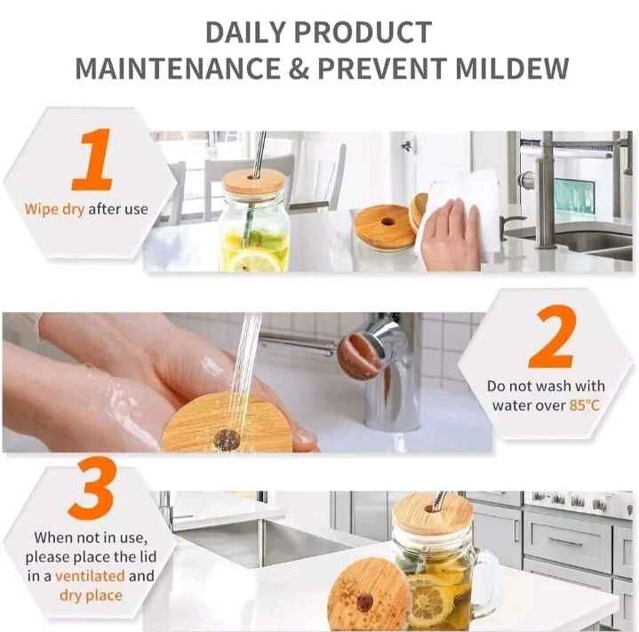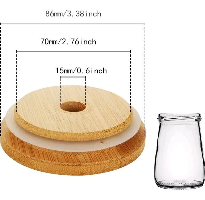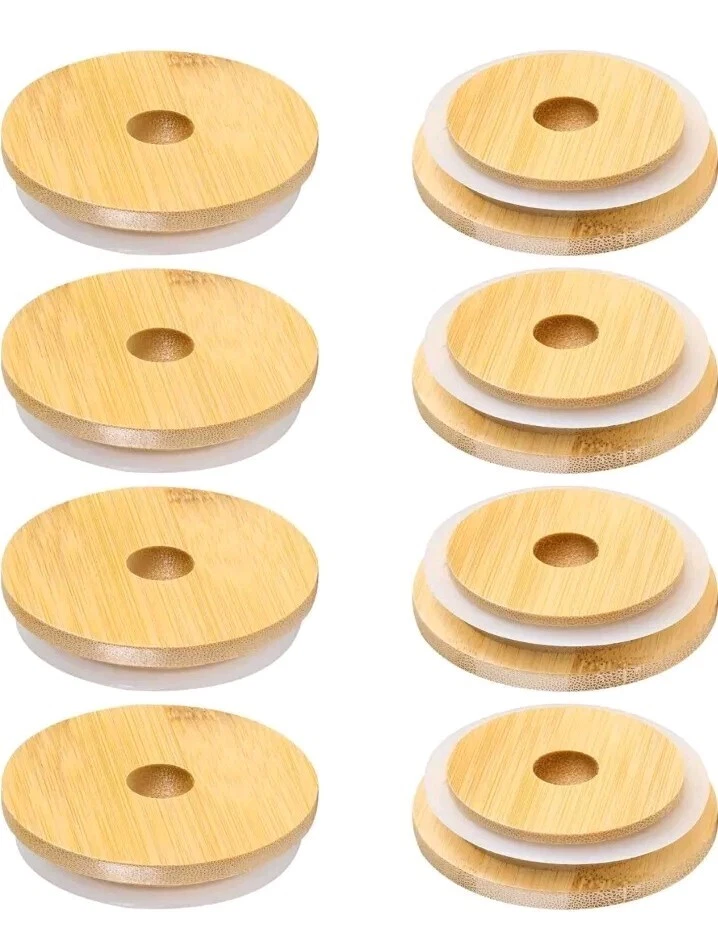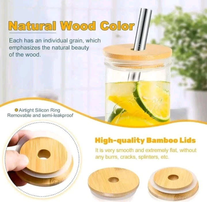 The set includes 8 wide mouth bamboo lids for Mason jars, along with metal straws and a cleaning brush. Perfect for eco-friendly and stylish drinkware, the lids are designed to fit 86mm Mason jars. The metal straws and brush make it easy to enjoy your favorite beverages while reducing single-use plastic waste.
