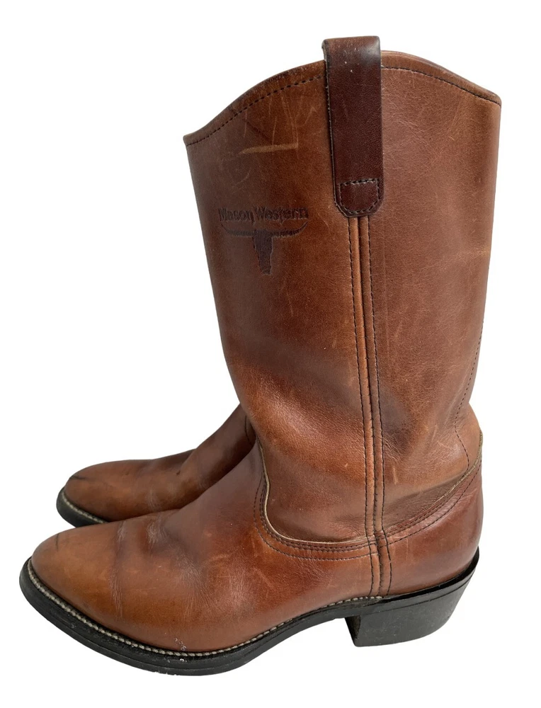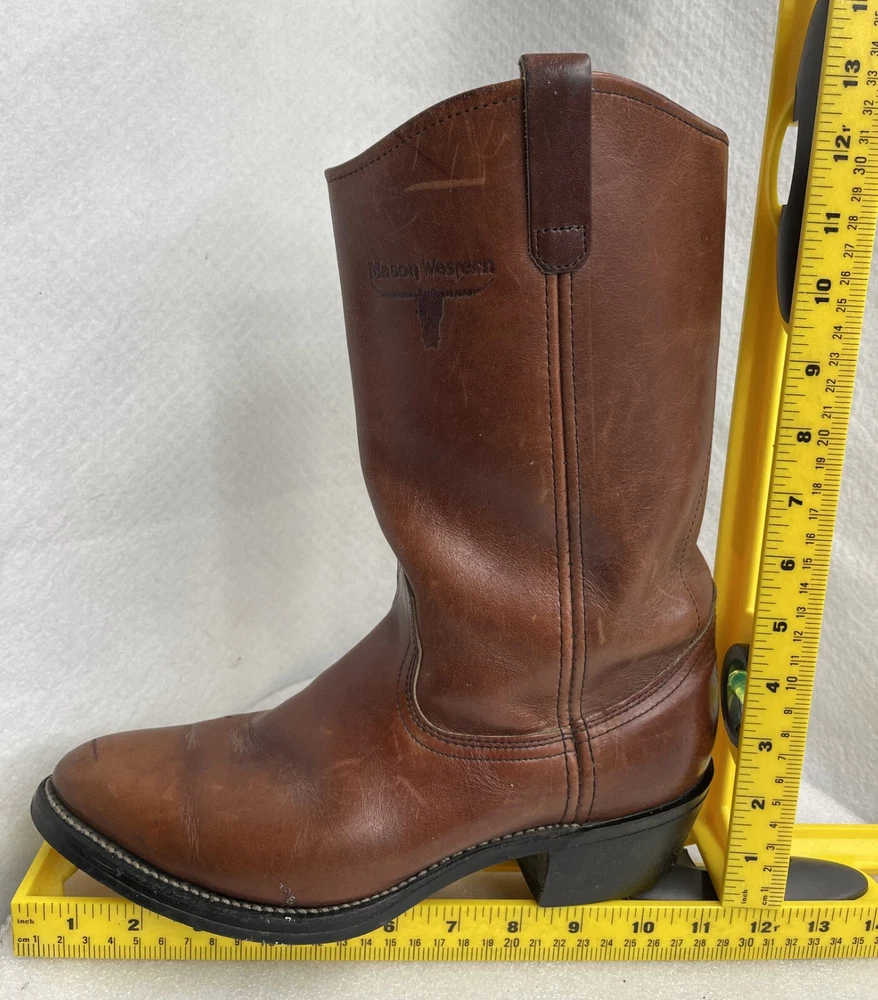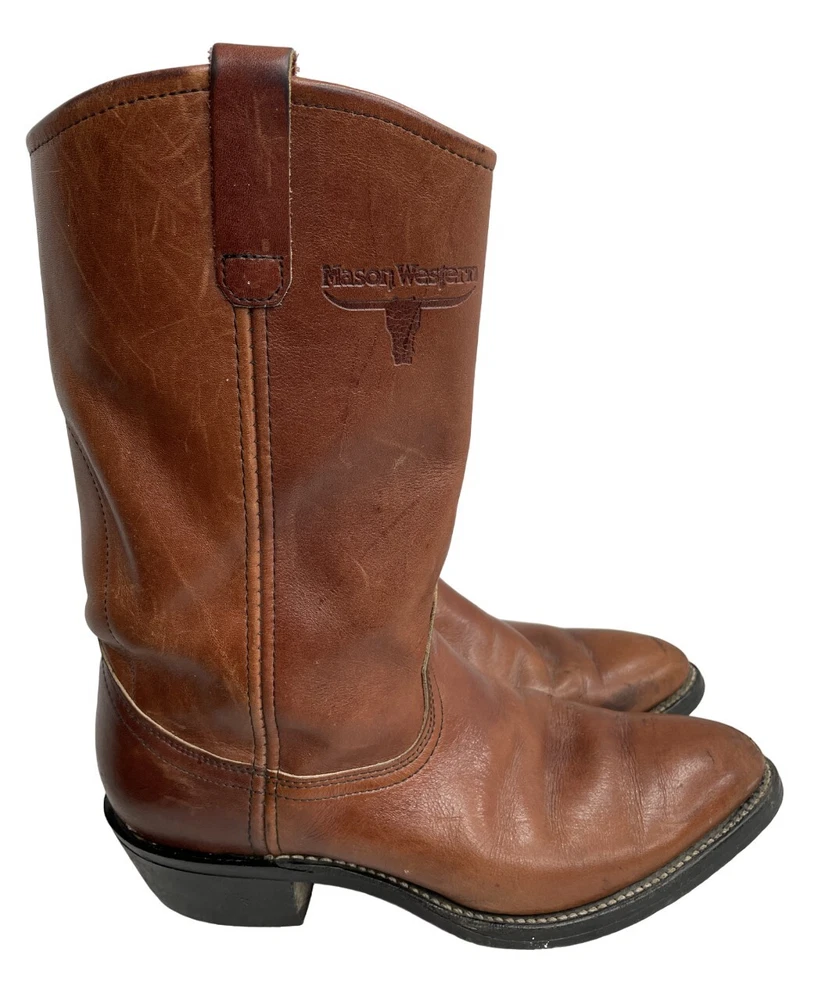 US Shoe Size: 8.5 Toe Shape: Almond Toe Style: Western Department: Men Shoe Width: D Brand: Mason Accents: Embroidered Color: Brown Features: Comfort Upper Material: Leather Type: Boot Closure: Pull On