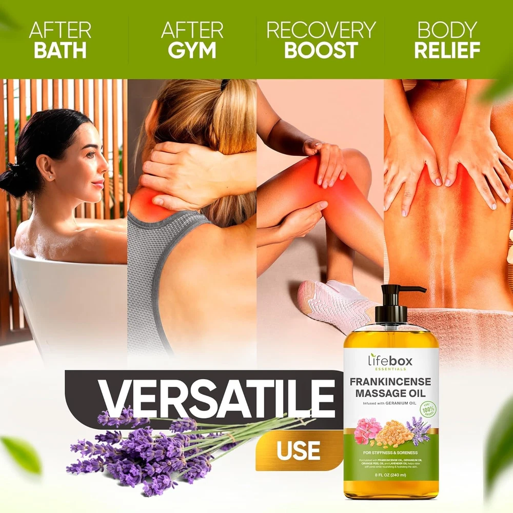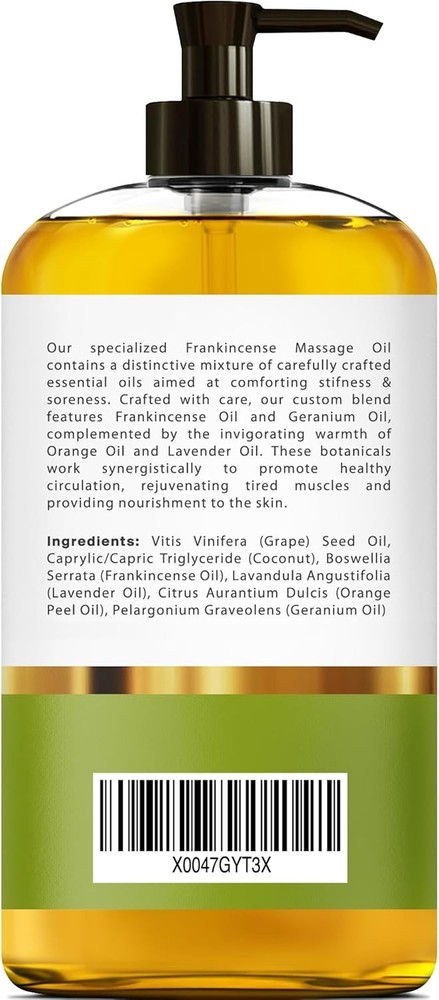Free eBay listing template designed by dewiso.com Frankincense Massage Oil – 100% Pure & Natural - Massage Therapy Oil for Soreness & Stiffness – Stretch Marks and Scars Body Oil Infused with Frankincense Essential Oil and Geranium Oil – 8 FL OZ FREE AND FAST SHIPPING! About this item FRANKINCENSE MASSAGE OIL FOR MASSAGE THERAPY – Our 100% Natural formula, expertly crafted to help alleviate soreness & stiffness. With its easy absorption and natural aroma, this oil helps eases tension while leaving your skin feeling deeply nourished and moisturized. FRANKINCENSE OIL & GERANIUM OIL – Both possess soothing properties that make them beneficial for soreness & stiffness. Combining these two oils helps provide a synergistic effect, offering both relief from discomfort and long-term benefits for recovery and relaxation. MADE WITH ALL-NATURAL POWERFUL INGREDIENTS – Made with a blend of all-natural ingredients, including Frankincense Oil, Lavender Oil, Orange Oil & Geranium Oil specifically designed to inducing relaxation. NON-GREASY & LIGHTWEIGHT – This fast-absorbing formula, effortlessly melts into the skin for a silky-smooth texture. Infused with a refreshing mint scent our massage oil with its natural soothing aroma, bids farewell to greasy residues. CRUELTY, PARABEN, SULFATE, AND PHTHALATE FREE – This massage oil for sore muscles is cruelty-free and made with clean ingredients, so that we can ensure a safer and more ethical choice for our customers, promoting both their well-being and that of the environment. Product We offer a 30-Day Return Policy on items which you are not completely satisfied with. You have the option for a full-refund or an exchange of the item. No returns are available on items shipped outside of the US . Shipping We offer Free Shipping to the US and ship within 2 business days of payment, usually sooner. We use UPS express shipping. That's why your products are usually delivered within 3 days . Contact We try our very best to make sure every customer is completely satisfied. If there's a problem , message us! We're happy to help. 24/7 live chat available.