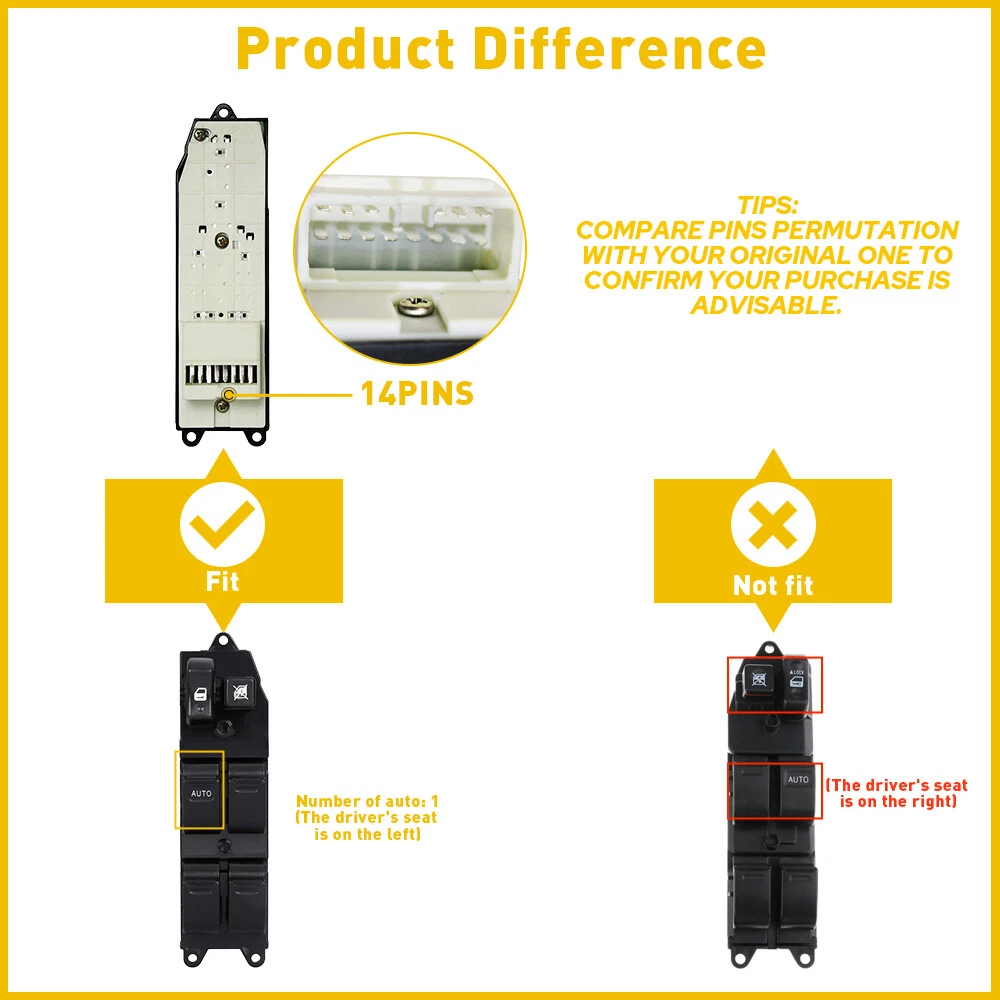 Window Control Switch Fits For Toyota,Chevrolet etc Fits for: 1998 TOYOTA 4RUNNER 98-99 TOYOTA AVALON 97-01 TOYOTA CAMRY 98-02 TOYOTA COROLLA 00-05 TOYOTA ECHO 98-02 Chevrolet PRIZM Specifications: OE:84820-60090, 84820-AA011,84820-04020 Pin quantity: 14pin AUTO:1(driver side+passenger side) Features: *Better stability with longer service life. *This power window switch fits, functions and matches the appearance of the original one for a perfect replacement. * Direct replacement without other tools. Master Power Window Door Switch for 1998-2002 Corolla Toyota Window Control Switch Fits For Toyota,Chevrolet etc Fits for: 1998 TOYOTA 4RUNNER 98-99 TOYOTA AVALON 97-01 TOYOTA CAMRY 98-02 TOYOTA COROLLA 00-05 TOYOTA ECHO 98-02 Chevrolet PRIZM Specifications: OE:84820-60090, 84820-AA011,84820-04020 Pin quantity: 14pin AUTO:1(driver side+passenger side) Features: *Better stability with longer service life. *This power window switch fits, functions and matches the appearance of the original one for a perfect replacement. * Direct replacement without other tools. * It has undergone simulation and endurance testing to ensure proper fit and performance. Packaging include: Window control switch*1 Item Specifics Type Switch Assembly Features Durable Manufacturer Part Number SD-00000148 Color Black Brand unbrand To Control Window Placement on Vehicle Door Country/Region of Manufacture Unknown Manufacturer Warranty Lifetime Interchange Part Number Left Driver's Side Lifetime Warranty Free Shipping Years 1998 1999 2000 2001 2002 Toyota Corolla years 1998 1999 2000 2001 2002 Master Power Window Door Switch California Prop 65 Warning WARNING: This product contains chemicals known to the State of California to cause cancer and birth defects or other reproductive harm. Material Plastic Finish OE Standard Modified Item No Fitment Type Direct Replacement Return Period 90 Days Retutn Period 90 Days - FULL REFUND Placement Rear Passenger's Door Warranty 1 Year OE/OEM Part Number 84820-60090, 84820-AA011,84820-04020 Superseded Part Number 84820-60090, 84820-AA011,84820-04020 FAQ ♥ If you have a decoding problem or any other problems, please contact us first, we will help you with it. We will reply you within 24 hours in working days. I'm a new seller, thanks a lot for your trust and convince! I will serve you with all my heart. ♥ Q1: Will this bulb fit my vehicle? A: We can match almost any vehicle to one of our bulb sizes. eBay only lets us include some vehicle fitments per listing, but if your vehicle does not show up on the compatibility table at the top of our listings, welcome you to contact us for free consulation before purchasing a product. Q2: My item has not arrived, what's taking so long? A: Sometimes items take longer than expected, especially if it’s going far or to rural area. Check with your post office to see if your item has been held up. Sometimes Royal Mail will not update a tracking number until it has arrived at its destination. If your item still don't arrive after a few days, let us know so we can double check for you and help solve it asap. Q3: My bulbs won't fit, help! A: Special bulb holder may be required. See if you can take the holder from the stock bulb. If not, let us know. The bulb size may be wrong, double check the item you received with the item you ordered. Do you have an aftermarket lighting housing? These may not be perfectly fitted for aftermarket bulbs and will require some manual modifications. Q4: Neither side lighting up? Both sides flicker, hyper flash, or work inconsistantly. A:Check the light fuses, and then check the ballast plugs to insure correct installation. If this doesn't work, there may be a voltage problem with the vehicle. You probably just need a relay or capacitor. Even though some bulbs are builtin resistors, they may still need a decoder. Pay & Ship (1). We gladly accepts payment via PayPal, We will ship your item(s) within 24 hours. (2). Before payment, please keep the consistency of Paypal address and ebay address. (3). Quantity orders are welcome! Returns (1). We offer 60 days free return policy. Please contact us within 60 days from the date you receive your order if you have any issues with the product or want return. Refund will be send after we got your resend package. (2). All returned items should be in the original packaging , return tracking information should be provided . Contact Us (1).Negative feedback will not help resolve any problems you have, please contact us via eBay messages before leaving negative feedback , our customer service will make best effort to help you with the issues. (2).We maintain high standards of excellenceand strive for 100% customer satisfaction! Feedback is very important to us. We request that you contact us immediately before you give us neutral or negative feedback, so that we can satisfactorily address your concerns. About us We're professional in car and motorcycle accessories, especially in LED bulbs. We have our own factory and R&D team. Our belief is to sell top quality items that fit your car and serve you with our heart. Anything please feel free to contact us! Our customer service is very responsibility. Come and follow us! DESCRIPTION NEW ARRIVED HOT SALE CONTACT US SAVE US Store Category Store Home Other Hot Item Master Power Window Control Switch For Dodge Avenger Chrysler 200 Jeep 4602780AB USD 23.74 12V LED 6 Gang On/Off Rocker Switch Panel Car Truck Boat Marine Inline Fuse Box USD 29.99 Oil Pressure Sensor Unit Sending For 03-08 Silverado Chevy 1500 2500 3500 Impala USD 13.29 Left Driver Power Mirror Switch Control 15045085 For Chevy Silverado GMC Sierra USD 12.99 For Jeep Grand Cherokee Dodge Durango 3.6L 5.7L 2011-2013 Window Switch 11 Pins USD 23.74 New List Item 2Set Oil Pressure Sensor Switch For Honda Accord &2010-2015 Honda Crosstour USD 16.99 Trunk Release Switch Button With License Plate Lamp For 2011-2016 Chevy Cruze US USD 12.99 Radio Worn Button Repair & Climate Control Decal F