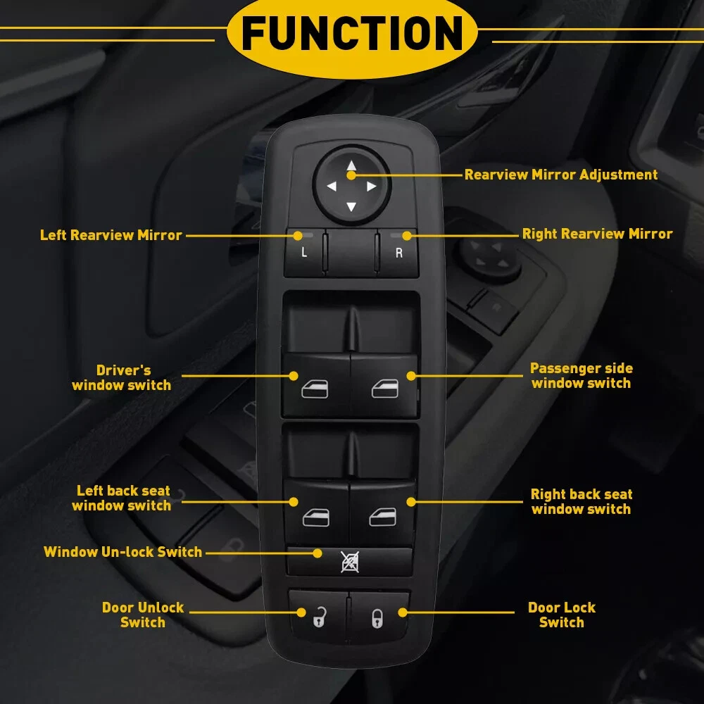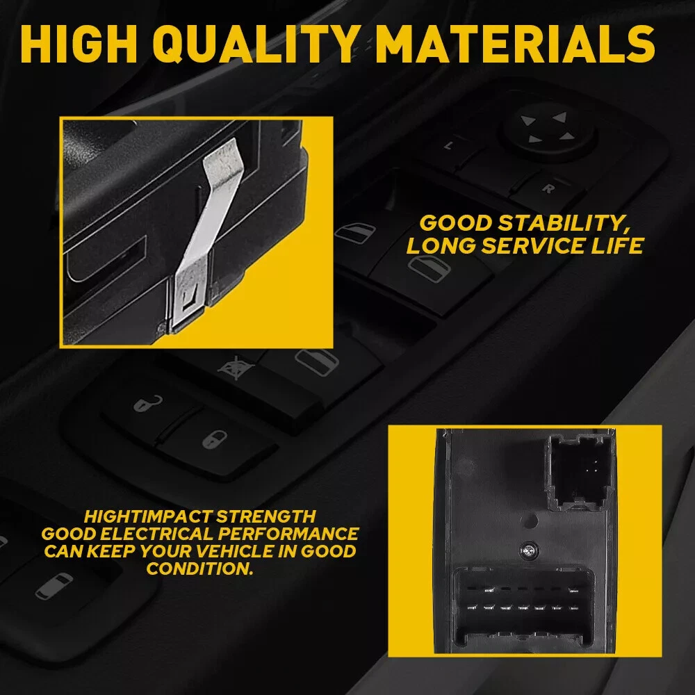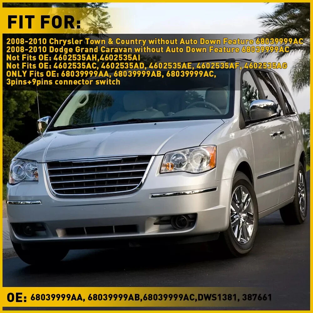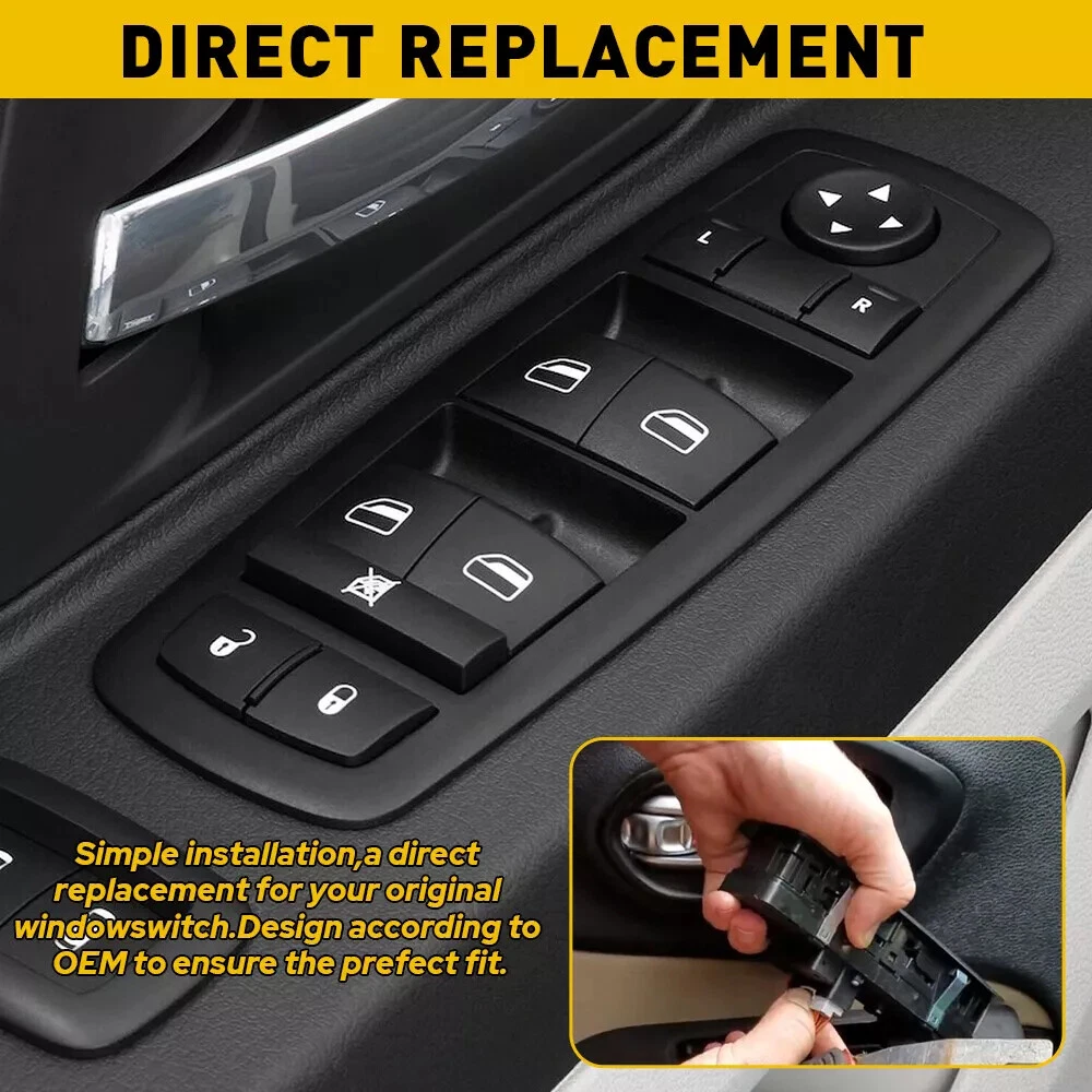 Master Power Window Switch For Dodge Grand Caravan 2008-2011 68039999AA Note: Please confirm the surface button and the back of pins before you buy. High quality OE factory production ,test each switch before shipping. Feature: -LH (Driver Side) FRONT -Easy install,direct replacement -Power Window Switch -Door Lock Switch -Window Lock Switch -Mirror Switch -Each item tested before shipment -Brand new product, 100% aftermarket -One Year's Warranty -High Quality and stable performance Specification: Color: Black To Control: Window Material: ABS Plastic Plug Pin Number: 12 Pins(9pins+3pins) Switch Type: Push Pull Switch Placement of Vehicle: Front, Left Fitment Type: Direct Replacement Manufacturer Part Number: 68039999AA Replace OE/OEM Part Number: 68039999AA Fitment: Fits For Dodge Grand Caravan 2008-2010 Fits For Dodge Journey 2009-2014 Fits For Dodge Caravan 2006-2007 Fits For Chrysler Town & Country 2008-2009 Fits For Jeep Grand Cherokee 2011-2013 Fits For Jeep Liberty 2008-2009 For Chrysler Town & Country 2008-2010 For Dodge Grand Caravan 2008-2010 Package Including: 1x Power Window Switch