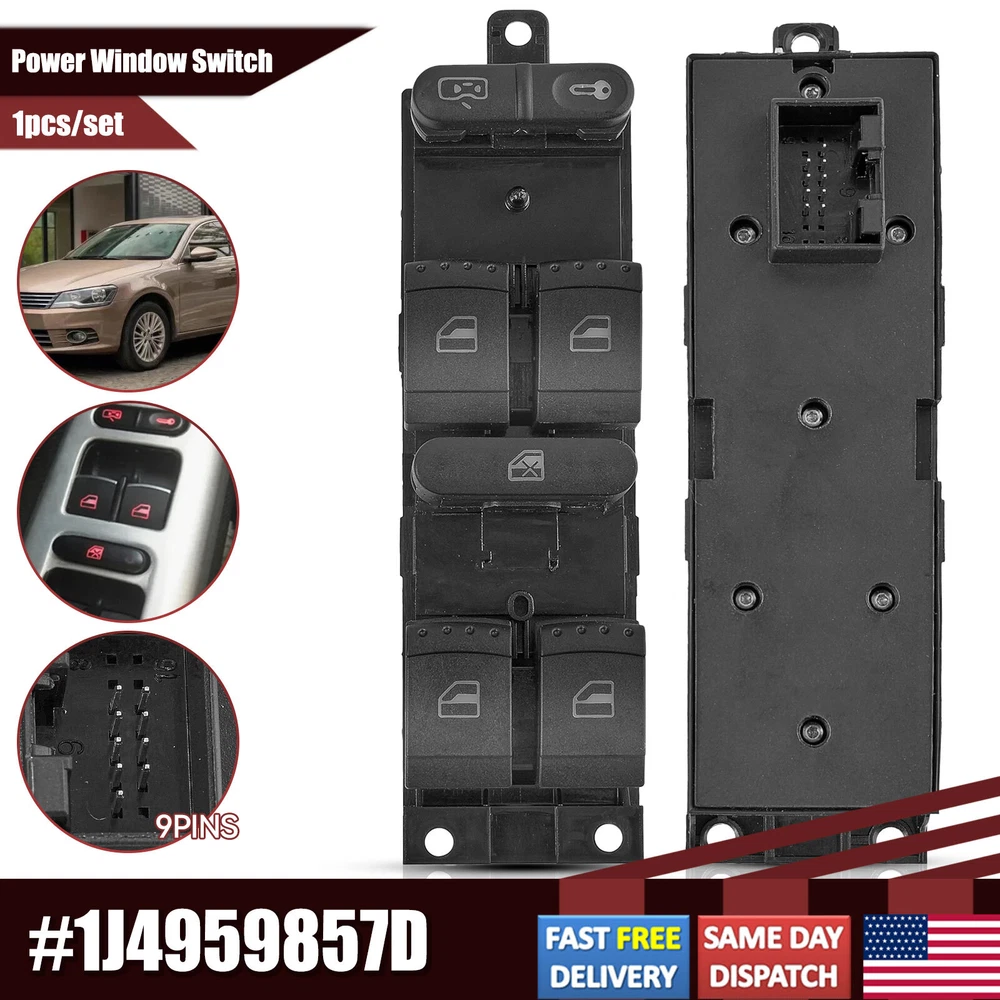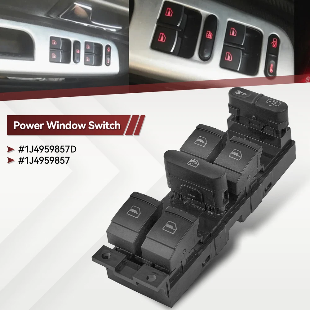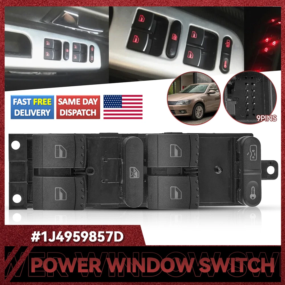 To Control: Window Fitment Type: Direct Replacement gtin13: Does not apply Switch Type: Push Button Manufacturer Warranty: 3 Months Interchange Part Number: 1J4959857, 1J4959857B Type: Switch Assembly Brand: Unbranded UPC: Does not apply OE/OEM Part Number: 1J4959857D Material: Plastic, metal Placement on Vehicle: Front Color: Black Features: Durable Universal Fitment: No