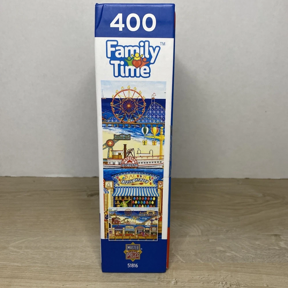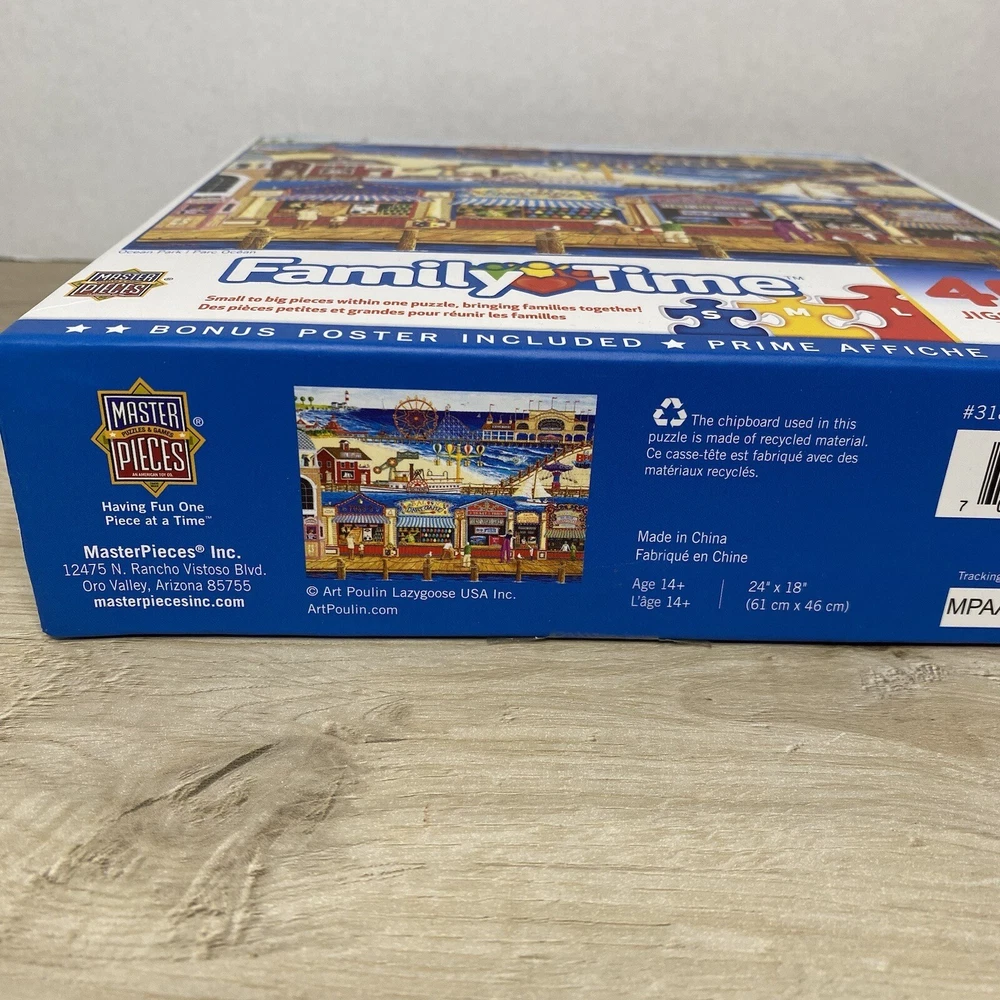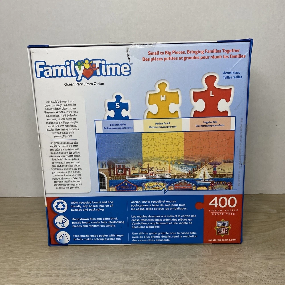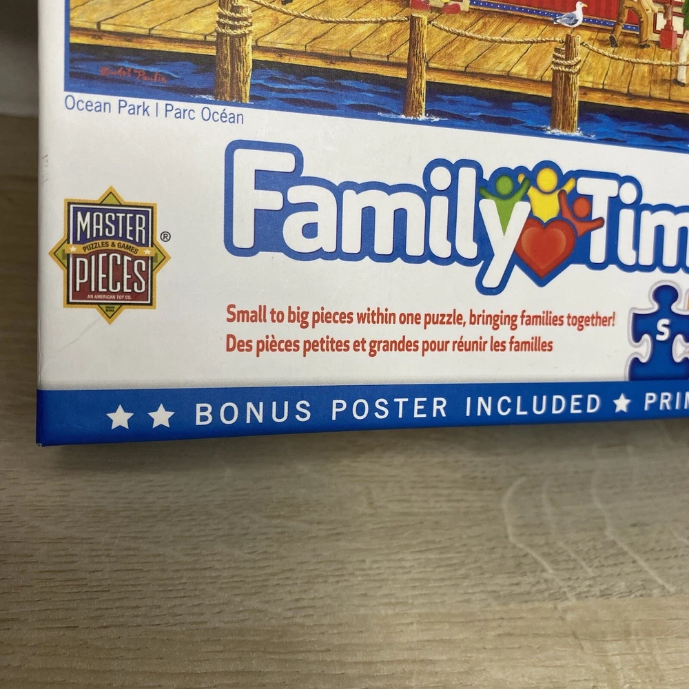 Masterpieces Family Time 400 piece puzzle Ocean Park. New sealed box includes bonus poster. Different sized pieces for all family members.