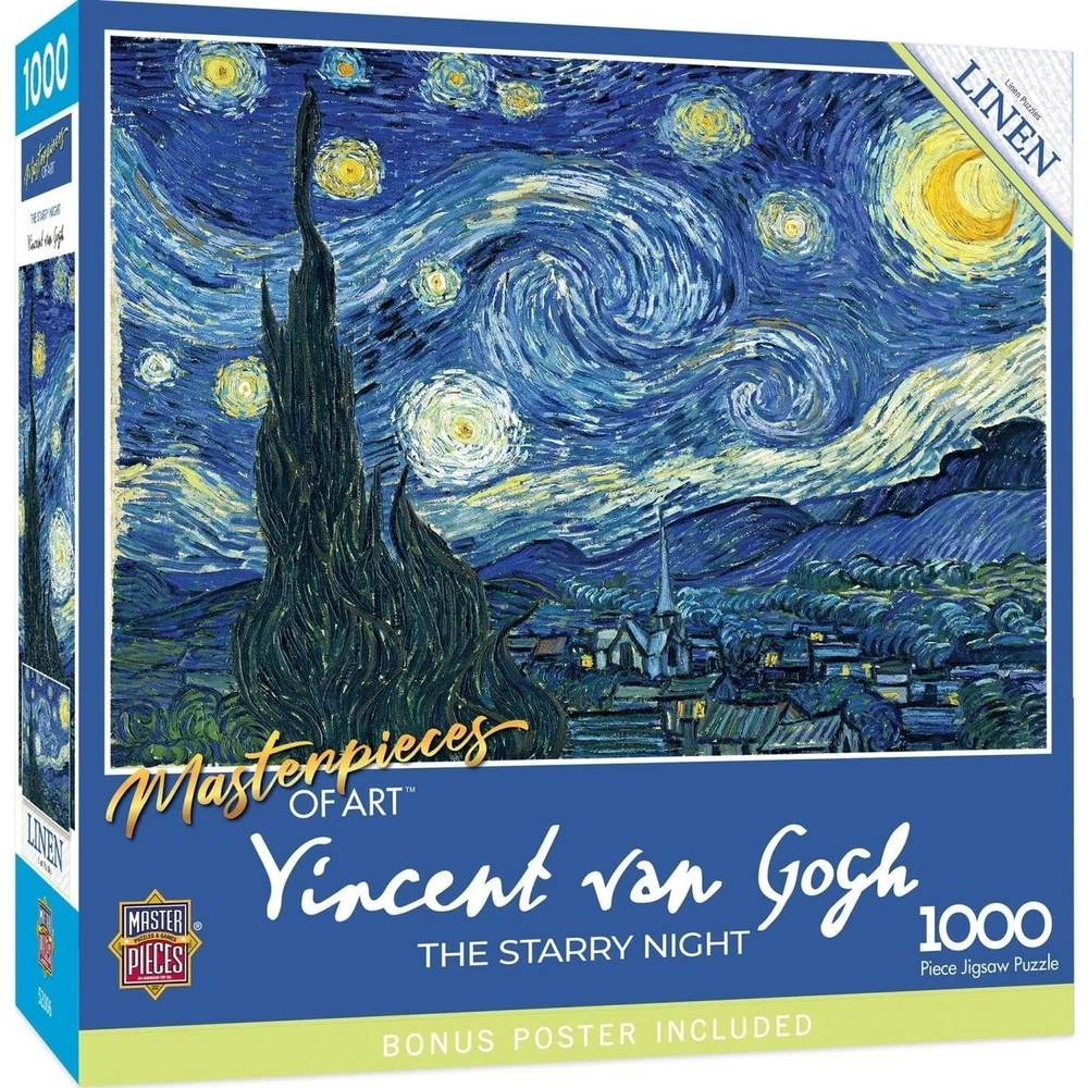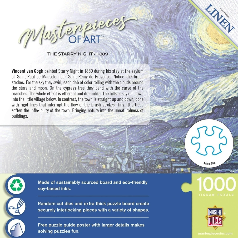This MasterPieces 19.25" x 26.75" 1000pc Van Goghs classic Starry Night in brilliant colorful detail. This puzzle is made of linen material which makes it easier to grip and see with no-glare. This linen puzzle is the perfect gift for any puzzle lover! To reduce their impact on our environment, the chipboard used in these puzzles is made of 100% recycled material. Masterpieces Starry Night 1000 Piece Jigsaw Puzzle 19.25X26.75 Linen Material This MasterPieces 19.25" x 26.75" 1000pc Van Goghs classic Starry Night in brilliant colorful detail. This puzzle is made of linen material which makes it easier to grip and see with no-glare. This linen puzzle is the perfect gift for any puzzle lover! To reduce their impact on our environment, the chipboard used in these puzzles is made of 100% recycled material. Product Attributes: Weight (lbs.) : 1.25 lb UPC: 705988720123 Brand: MasterPieces