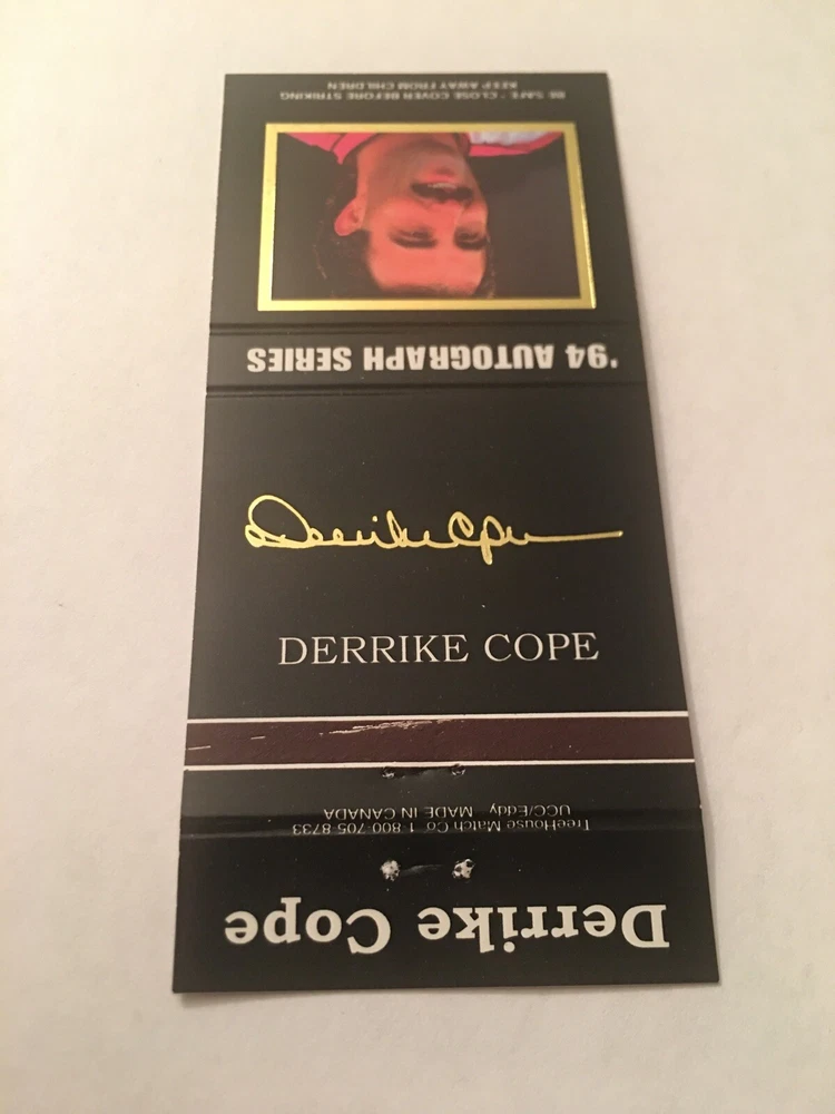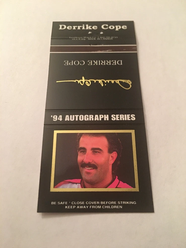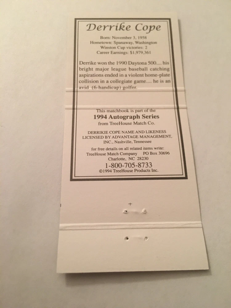Matchbook Cover Matchcover Auto Car Racing 1994 Derrike Cope Condition - striker is unstruck, corner wear, edge wear Combined shipping is available For matchbook covers 1 st one is $.50 and each additional is $.10 Can also be combined with other items Inventory M