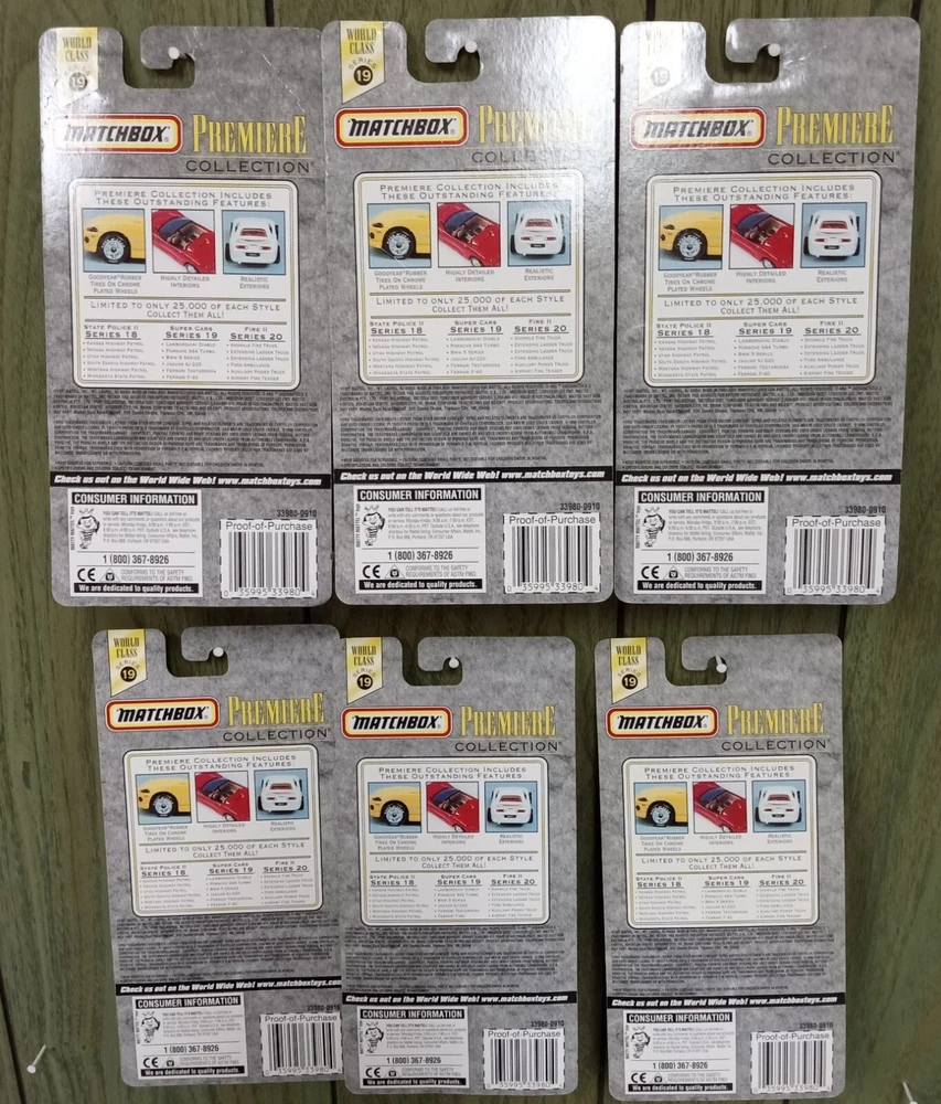 Matchbox 1997 Premiere Collection World Class Series #19 Super Cars complete set of 6 NIB no cooties on these cars brand new untouched cards in fantastic condition for over 25yrs old just like off the shelf from store. Private collector selling collections to help with daughter college expenses. Take a good look at them have a great day.