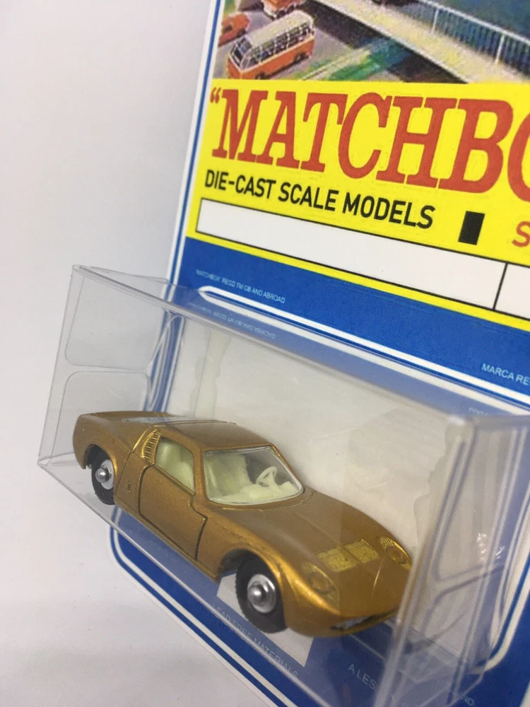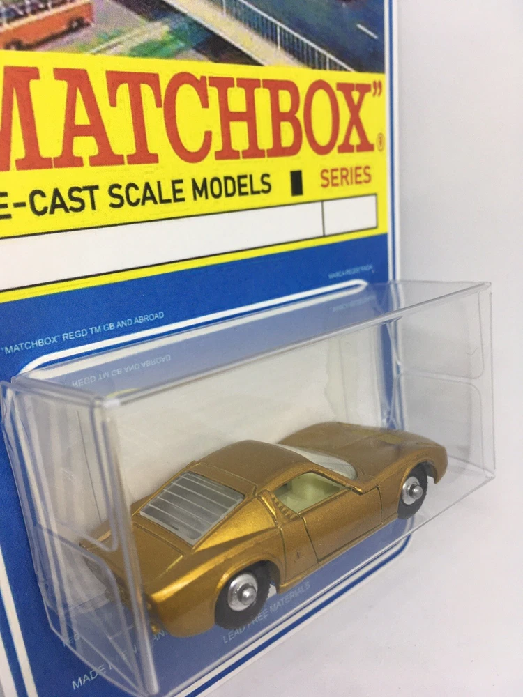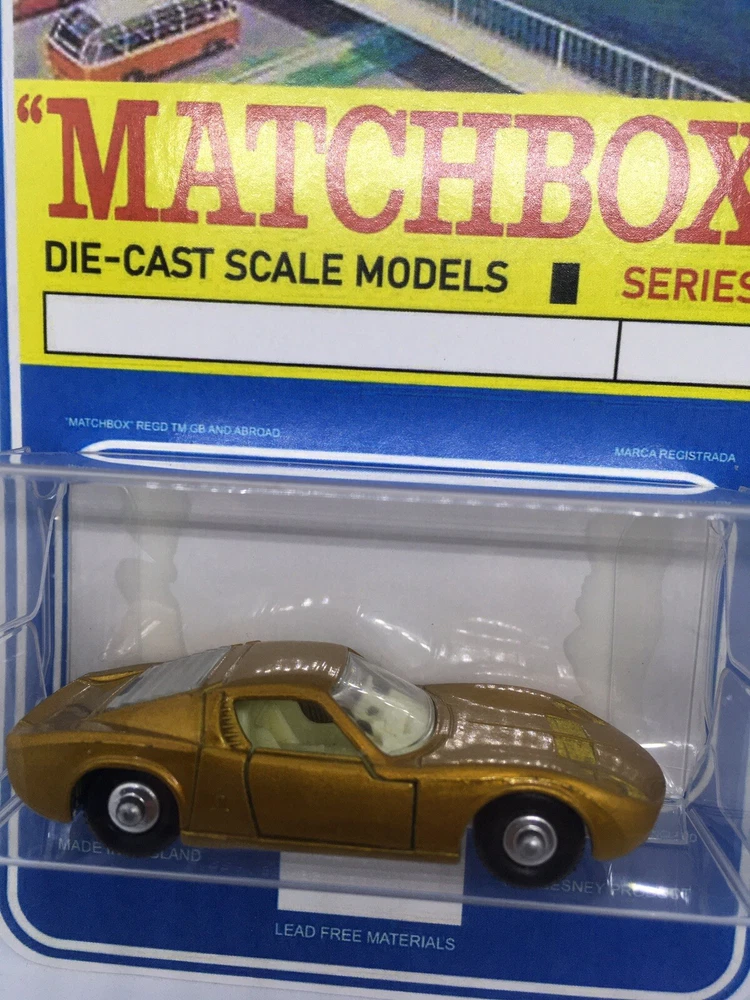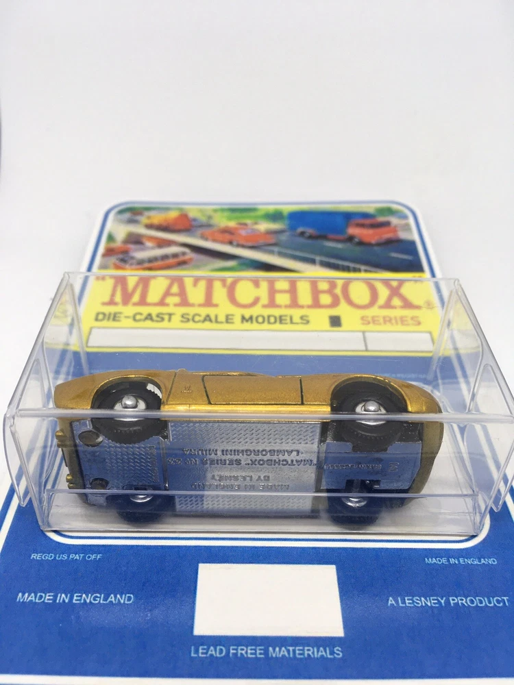 Welcome to Phantom Matchbox Lesney. Today we have a matchbox lesney custom #33 Lamborghini with disc wheels. Not original. Restored. Base swap. My new displayable storage blister pack. I am an avid matchbox collector who in my spare time likes to take used matchbox toys and create some rare and my own variations that Lesley and Rodney Smith might of considered making them selves. My models are not original factory toys unless clearly stated. If you are not completely satisfied with any model please return for complete refund minus return shipping. As always combined shipping on multiple orders. Remember this is a hobby, models are all used and may have imperfections like scratches in glass and scuffed tires etc. Please look at all pictures as this is part of the description, please ask questions before bidding. Good luck and thanks for stopping by. Any combined auctions totaling $100 or more will be shipped registered.