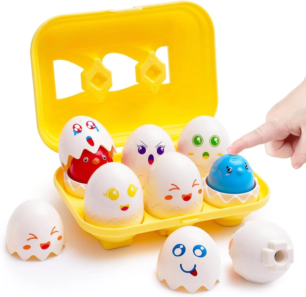 Funny Toddler Learning Toy: 12 charming eggs in a carton will help preschoolers learn to count, sort, and match! Exercise children's hand-eye coordination. Each plastic egg contains a different color and number, with corresponding pegs and holes Cultivate Smart Minds: These interactive eggs will improve hand dexterity, color recognition, and fine motor skills. Enrich the baby's knowledge Adapt To Child Design: 2.2" x1.8" eggs are perfect for little fingers to grasp and maneuver. Fine workmanship allows children to open it independently. Very suitable for children over 2-3 years old Friendly And Harmless Material: Made with top quality child-safe materials non-toxic tasteless, meticulous workmanship, each corner is smooth. Sturdy plastic case super convenient for quick 'n easy storage Customer Satisfaction: If you have any questions about our products, please let us know right away and we will solve the problem for you Product Description Matching Eggs-12p Great Easter Eggs The package size: 11.8 x 3.9 x 2.7 in. This set of interactive eggs is a perfect way to engage little minds and teach them color, shapes, numbers and matching skills and help them improve hand-eye coordination as well as fine motor skills. Child Friendly Design 2.2" x1.8" eggs are perfect for little fingers to grasp and maneuver. Fine workmanship allows children to open it independently. Very suitable for children over 2-3 years old. Friendly and Safe Design Made with top quality child-safe materials non-toxic tasteless, meticulous workmanship, each corner is smooth. Sturdy plastic case super convenient for quick 'n easy storage. Matching Eggs Set is a wonderful color and shapesorting toy. With these educational shaped eggs, you cantrain sorting and matching skills of your children. Let your kidsrecognize the color and shape when they split the eggs. This setincludes 12 shaped puzzle eggs in 6 colors, 24 half pieces in total. Really agreat gift package! Notes: Eggs may be a little tight when playing for the first time,Please help ourchild open Screw these eggs. Details: Totalweight:0.88lb Egg weight:0.4lb Material: Non-toxic plastic Eggsize:(L/2.2 in, W/1.6 in) Overall size:(L/11.8 in, W/3.9 in,H/2.7 in)
