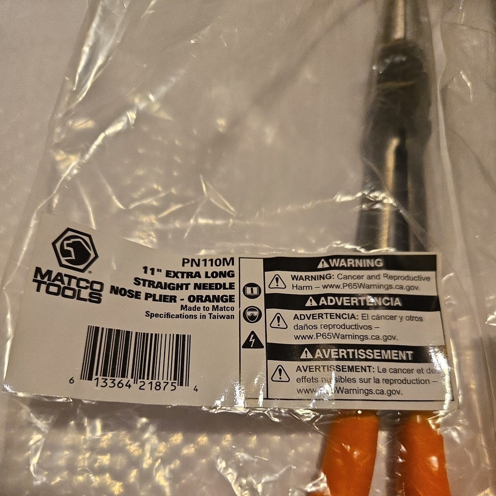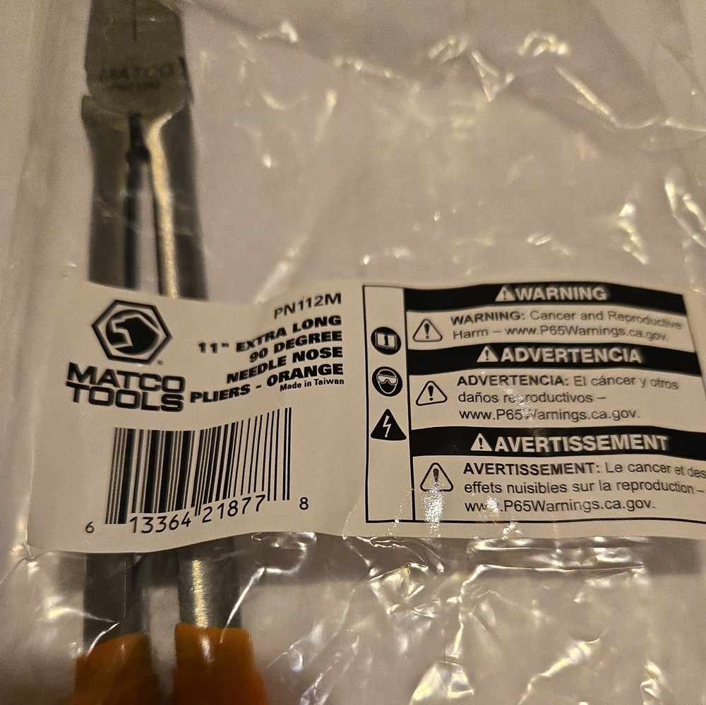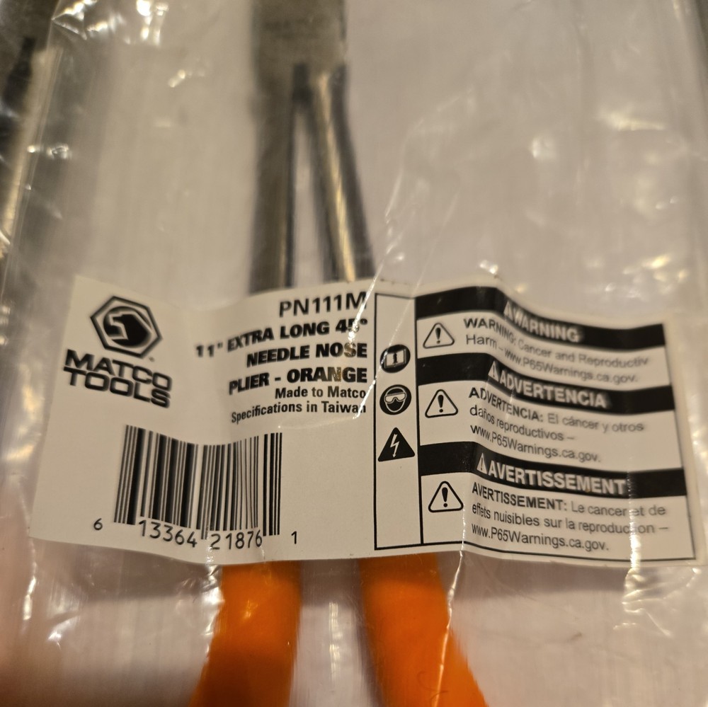 Matco 11" Straight, 45°, and 90° Orange handle pliers. Matco Numbers PN110M PN111M PN112M Brand New, Never Used, No Owner Marks or Toolbox Wear. Free Shipping within the Continental US with UPS Ground or Ground Saver. Any other shipping will be at buyers expense. Pics or actual items. Thanks