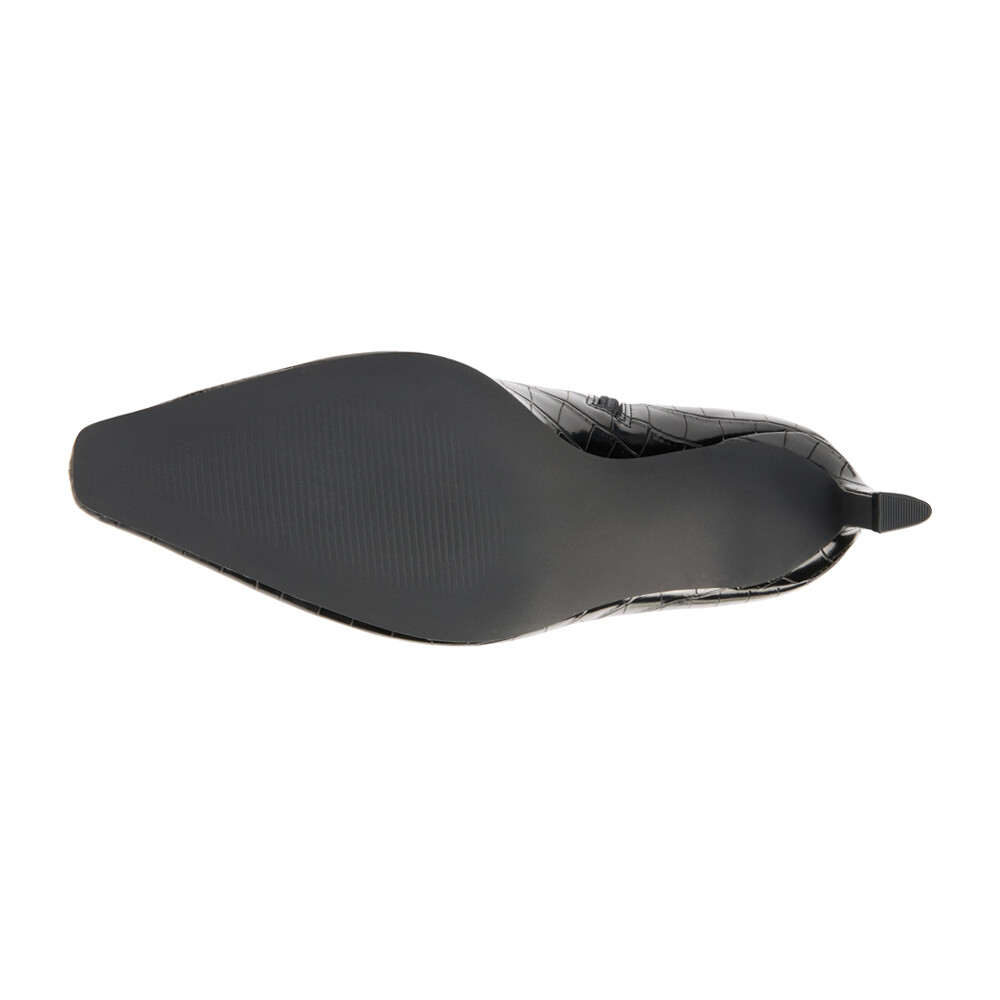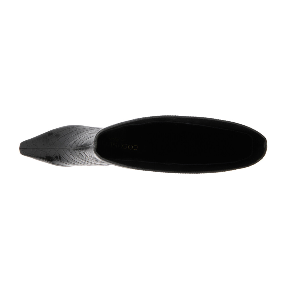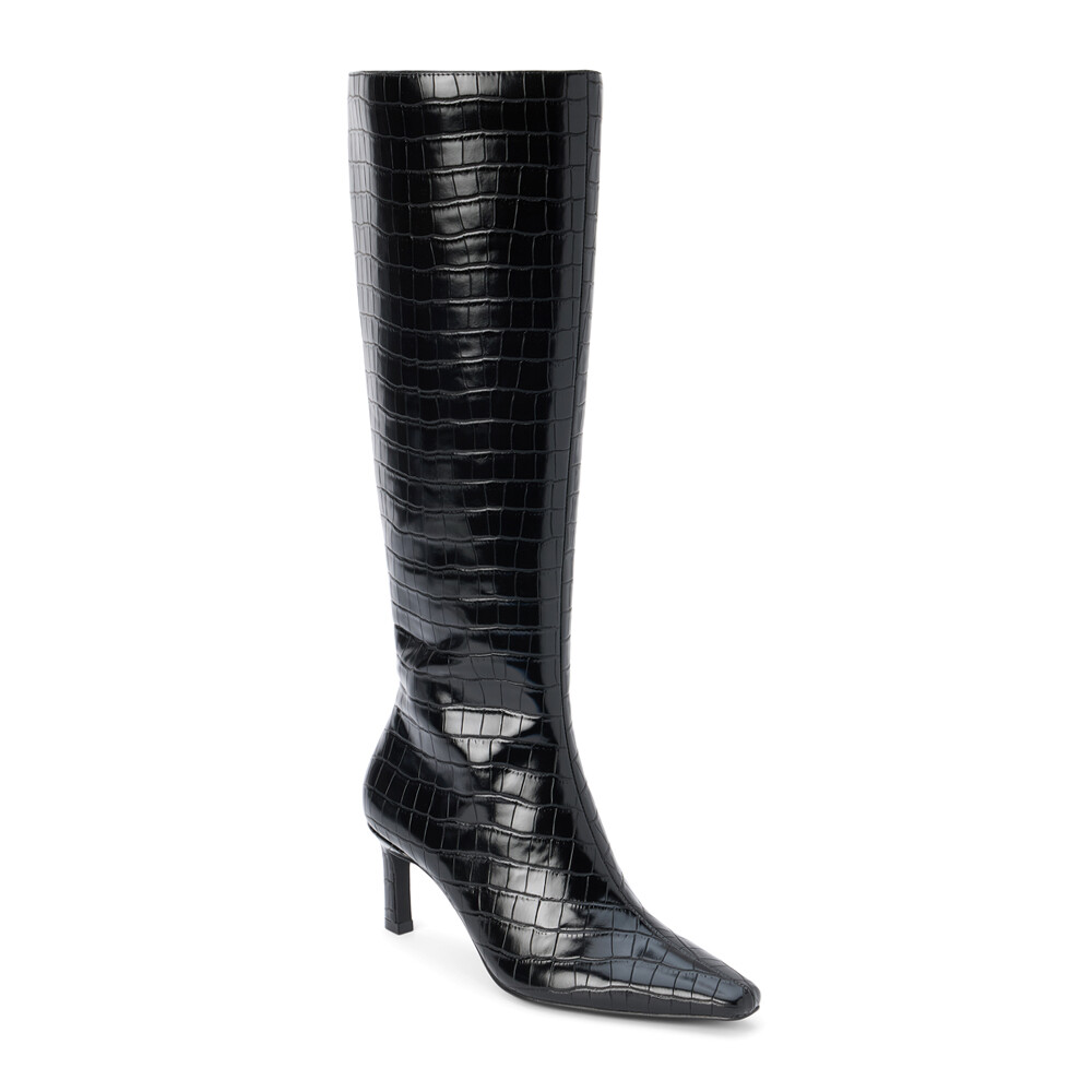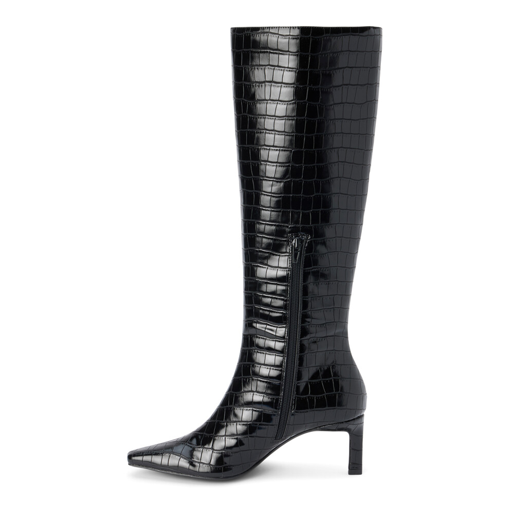 Robbie Croc Embossed Pointed Toe Zippered Platform Boots Product Details Textile lining Padded insole Pull on style Heel Height: 2.5 inches, Shaft Height: 17 inches, Circumference: 16 inches Vegan pointed toe knee high boot with exotic embossing. Additional Details Color: Black Occasion: Casual Gender: Womens Age: Adult Brand: COCONUTS by Matisse