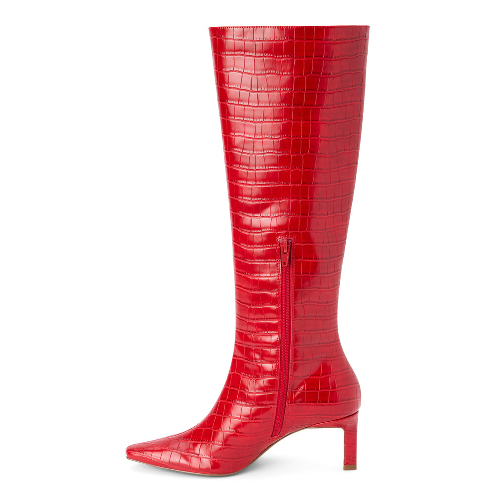 Robbie Croc Embossed Pointed Toe Zippered Platform Boots Product Details Textile lining Padded insole Pull on style Heel Height: 2.5 inches, Shaft Height: 17 inches, Circumference: 16 inches Vegan pointed toe knee high boot with exotic embossing. Additional Details Color: Red Occasion: Casual Gender: Womens Age: Adult Brand: COCONUTS by Matisse