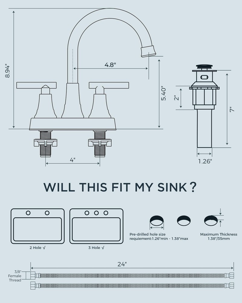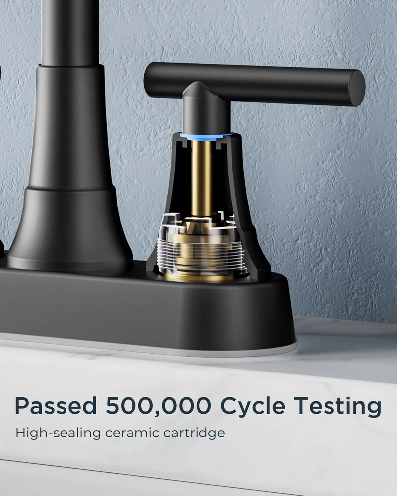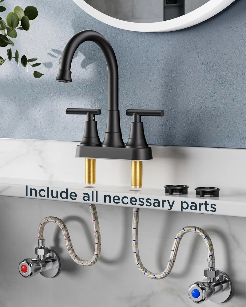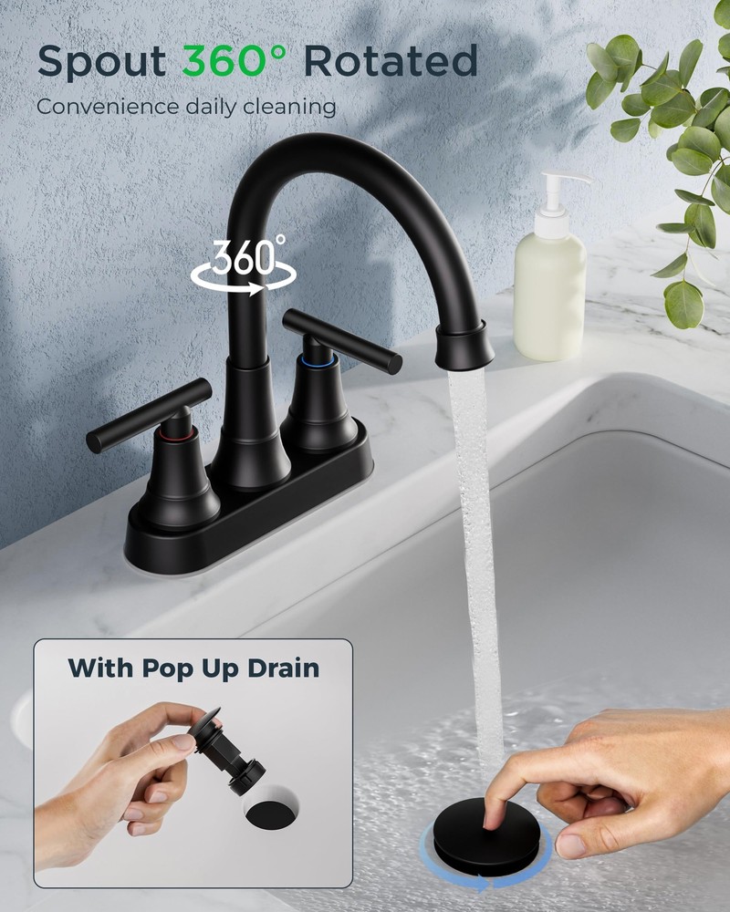 Matte Black Bathroom Sink Faucet, 4 Inch Centerset Bathroom Faucet 2 or 3 Hole with Pop up Drain and cUPC Hose, Two Handles Control, 360° spout for Restroom,Vanity, Rv Leak-Free and Drip-Free: 's Bathroom Faucets advanced drip-free ceramic valves tested for 500,000 times water tightness, the 2 handles allow effortless flow and water temperature control. 360-degree swivel high spout height bathroom faucets offers plenty of bathroom sink space and coverage for easy handwashing User-Friendly Installation: 4 inch bathroom faucet for bathroom sink or counters, making installation convenient and requiring no plumber or specialized tools. With just a few simple steps, you can easily complete the installation. We provide detailed installation video to guide you through the process effortlessly Safety and Healthy Bathroom Faucet: black bathroom faucet 3 hole are certified to cUPC and NSF 61 Lead-free Standards and premium material, provide safe drinking water for your daily life. Adopt rust-resistant nylon braided water supply lines, caring for your family's health. The safety and healthy bathroom sink faucet improve your life quality Pop-Up Drain and Removable Aerator: The Pop-up drain with built-in strainer swiftly filters debris to prevent clogs, adding convenience to your daily routine. Also the bubbling aerator no-splashing aerators, which reduces water consumption by 30% User-Friendly Service: Our's sink faucet bathroom will undoubtedly match your bathroom accessories and compliments a variety of bathroom decor, home decor, house decor, restroom decor, bathroom vanity, RV sink, travel trailer, pedestal sink, powder room, laundry room, outdoor, farmhouse, apartment, rental houses Shipping We offer FREE shipping on all orders! We ship within Three business days of payment, usually sooner. We use a selection of shipping services such as UPS, FedEx, USPS etc. We only ship to the lower 48 states, no APO/FPO addresses or PO Boxes allowed. Local pickups and combined shipping options are not provided at this time. Return You can return a product for up to 30 days from the date you purchased it. Any product you return must be in the same condition you received it and in the original packaging. Please keep the receipt. Payment We accept payment by any of the following methods: PayPal Please pay as soon as possible after winning an auction, as that will allow us to post your item to you sooner! Feedback Customer satisfaction is very important to us. If you have any problem with your order, please contact us and we will do our best to make you satisfied. Contact Us If you have any queries, please contact us via ebay. We usually respond within 24 hours on weekdays. Please visit our eBay store to check out other items for sale! Thank you for shopping at our store.