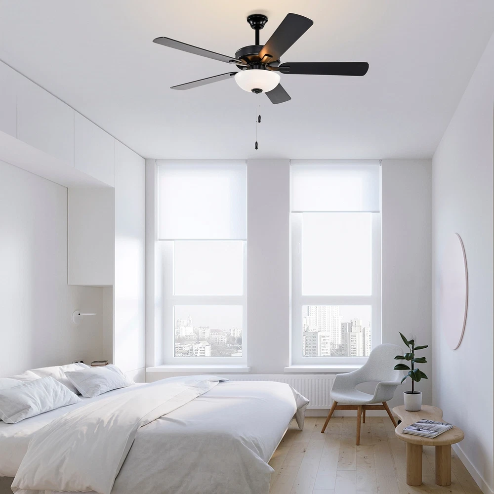 Deliver modern style with this matte black ceiling fan. By using a pull chain, you can choose between three different speeds for customized airflow and maximum comfort. Two 9W medium E26 base bulbs (included) are surrounded by a white diffuser, which will provide plenty of illumination. The reversible black and rustic charcoal wood blades complement modern decor. Place this ceiling fan in any living room or bedroom that is in need of a renovation. Features: Matte black finished Ceiling fan with white plastic shade 5 reversible black / rustic charcoal blades for versatility Takes two (2) max 9-watt medium (E26) base bulbs (Included) 3-speed reversible motor creates strong air circulation Indoor use, large rooms Pull chain included UL listed Energy StarDimensions: Overall: 52 in. Free Shipping Over $49.99* Details Matte Black 52 in. Indoor 5-Blade Reversible Ceiling Fan with Light Kit and Pull Product Description: Deliver modern style with this matte black ceiling fan. By using a pull chain, you can choose between three different speeds for customized airflow and maximum comfort. Two 9W medium E26 base bulbs (included) are surrounded by a white diffuser, which will provide plenty of illumination. The reversible black and rustic charcoal wood blades complement modern decor. Place this ceiling fan in any living room or bedroom that is in need of a renovation. Features: Matte black finished Ceiling fan with white plastic shade 5 reversible black / rustic charcoal blades for versatility Takes two (2) max 9-watt medium (E26) base bulbs (Included) 3-speed reversible motor creates strong air circulation Indoor use, large rooms Pull chain included UL listed Energy Star Dimensions: Overall52 in. Dia. x 16.7 in. H Blade 21.25 in. L x max. 5.5 in. W Downrodone (1) 4.25 in. H Blade Pitch12 degree Canopy5.1 in. L x 2.3 in. H Fan Efficiency: Airflow3289 Cubic Feet Per Minute Airflow Efficiency110 Cubic Feet Per Minute Per Watts Energy use32 Watts