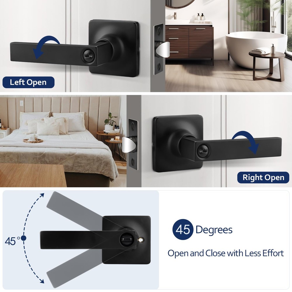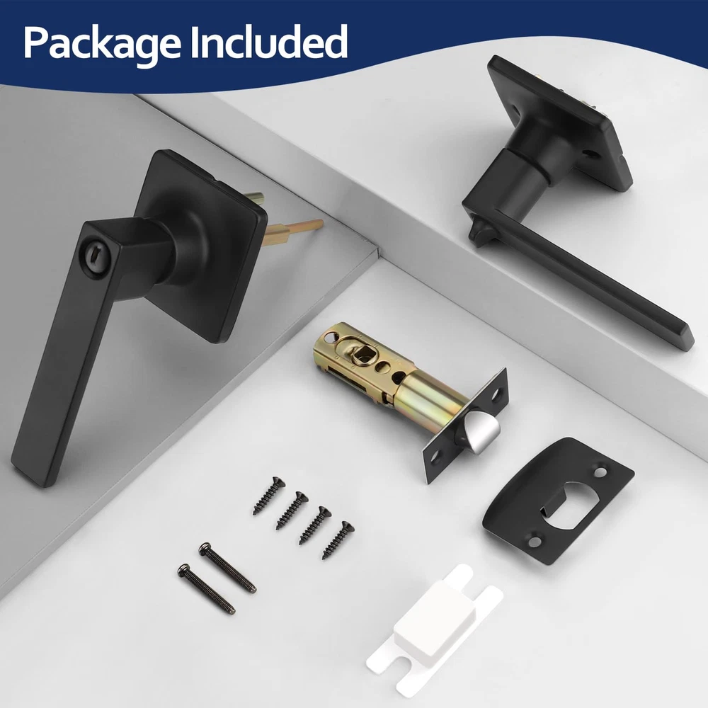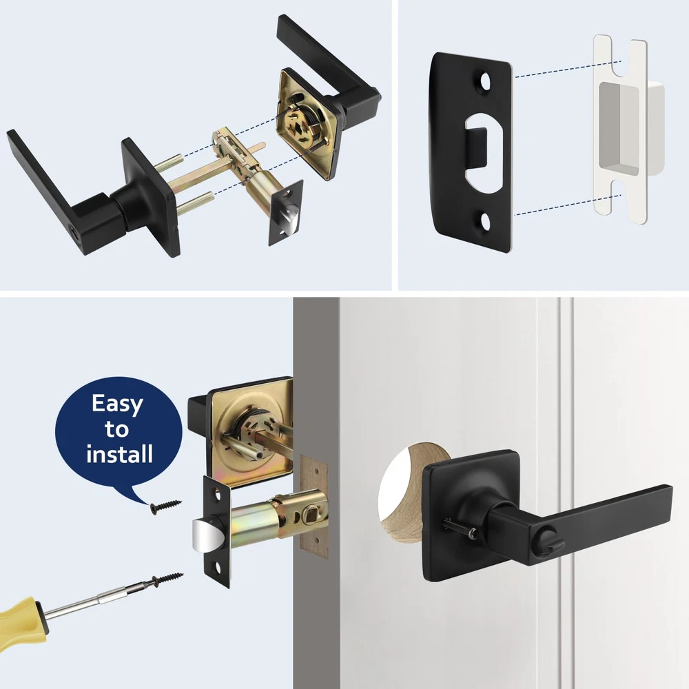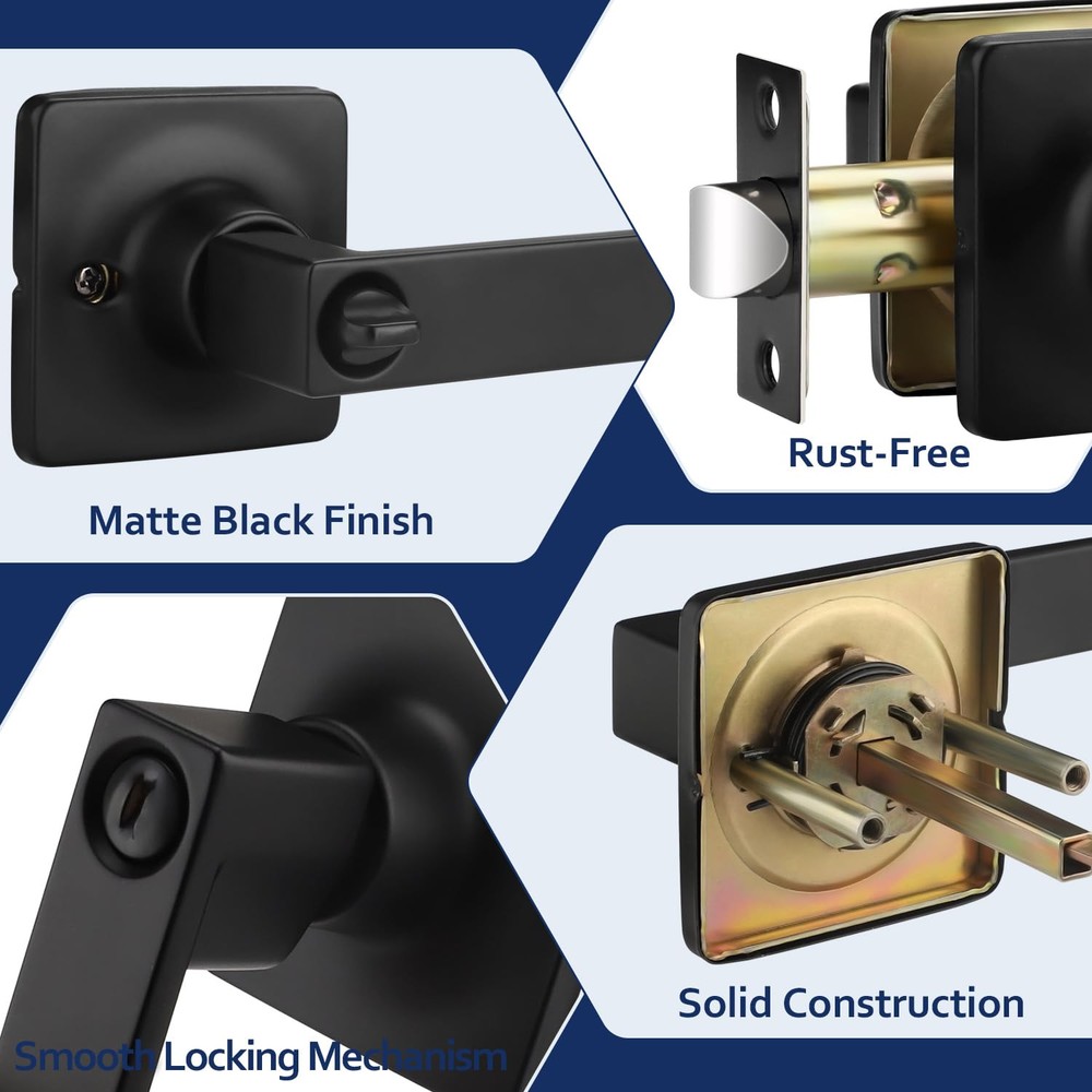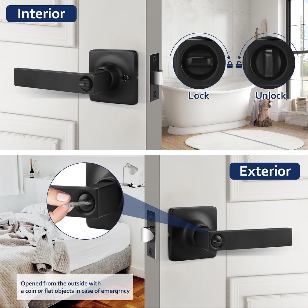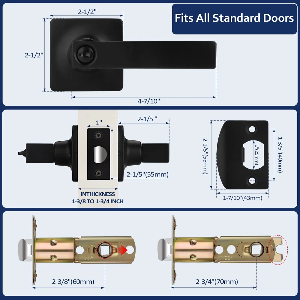 Privacy Door Handle: This door handle is keyless, you can easily enter by pressing the handle down; Meanwhile, it can be locked from the inside to provide you with your own private space; If there is an emergency that someone is locked inside, you can use a flat object, like a coin, to put it into the groove and rotate it to open the door from the outside; Recommended for bathrooms, bedrooms and anywhere you require privacy Sturdy and Durable: Our door handle is made of high-quality zinc alloy, which is both sturdy and durable, so you don't have to worry about a short use life or the handle breaking easily; The thick electroplated coating also makes it impossible to scratch easily; Besides, it is waterproof and rust-free, making it works for a long time even in humid environments; There is no doubt that it is a great choice for your daily use Matte Black Finish: This door handle is square in design and features a matte black finish; Understated yet elegant, it will fit in well with the modern-style room door and add a solid and simple touch to your home Convenient & Adjustable: Please refer to the instructions for installation, you can install it successfully with just a screwdriver; In addition, our latch can be adjusted between 2 3/8 inches (60 mm) to 2 3/4 inches (70 mm) from the edge and fit doors from 1 3/8 inch (35 mm) to 1 3/4 inch (45 mm) thick; To avoid your inconvenience, please measure the basic size of your door before purchasing Satisfactory Service: We not only provide good products, but also serve you wholeheartedly; Whether you have pre-sale inquiries or after-sale problems, please feel free to contact us, we are always here to help you