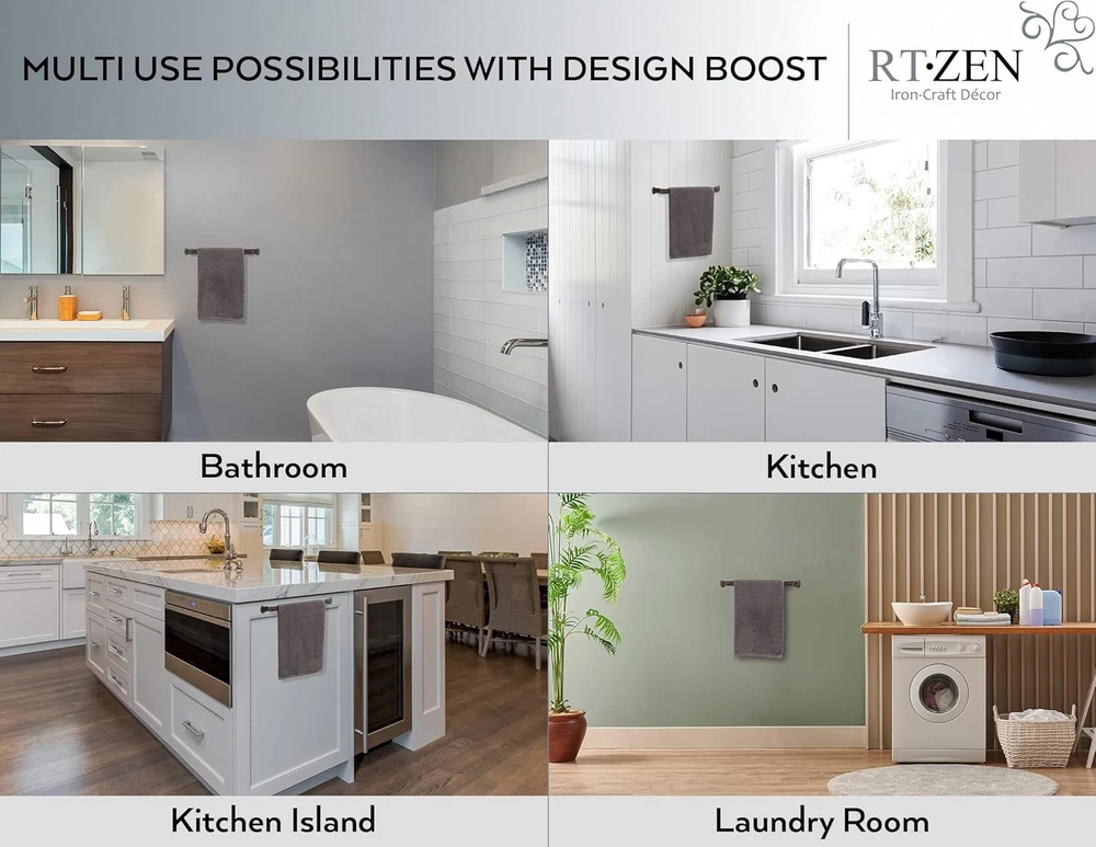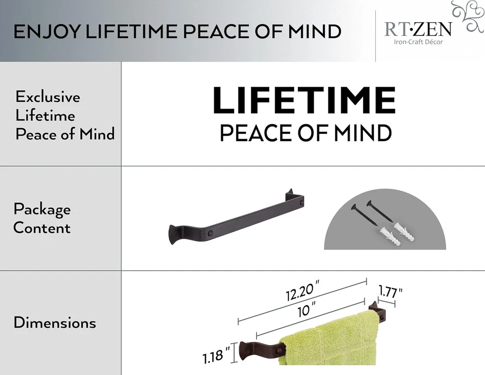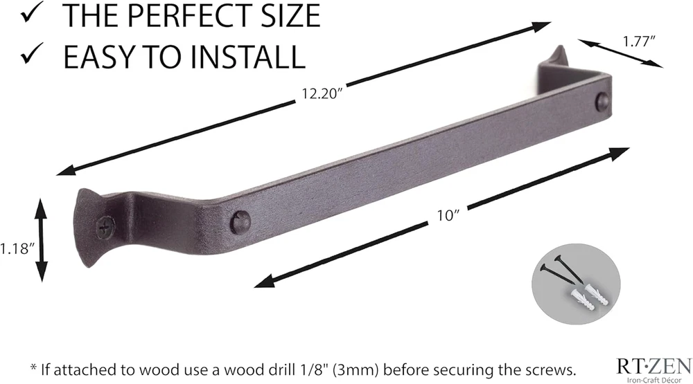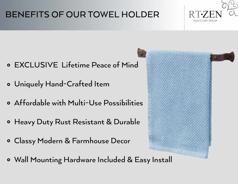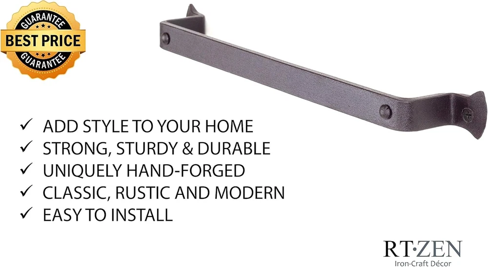 Store New Arrivals Add to Favorite View Feedback Contact Matte Black Hand Towel Holder for Bathroom - Handcrafted Farmhouse Wrought Iron Kitchen Towel Bar - Hand Towel Bar Hanger for Home or Office - Wall Mounted Rack Fits 10" Towels Description Item Shape Rectangular Item Dimensions L x W x H 12"L x 1.18"W x 1.77"H Color Black Product Dimensions 12"L x 1.18"W x 1.77"H Material Zinc Plated & Powder Coated Wrought Iron Material Type Zinc Plated & Powder Coated Wrought Iron Style Hammer-Nail Installation Type Wall-Mounted Shape Rectangular Model 9068 Finish Types Black Matte Powder Coated Wrought Iron Finish Type Black Matte Powder Coated Wrought Iron PEACE OF MIND - Black Wrought Iron Classy Décor Hand Towel Bar. Hand Forged Premium Iron Craft Wall Item. Universal Style for Modern Farmhouse Minimalist Western Vintage Boho Interior Design HEAVY DUTY WATERPROOF SOLUTION - Rustproof Premium Top Quality Wall Mount Straight Rod. Sturdy Solid Zinc Galvanized Black Towel Bar. Tough Matte Craft Built to Last Hand Towel Holder VERSATILE MULTI ROOM USES - Freestanding Space Saving Storage for Handtowels. Pot & Pan Organizer for Kitchen. Hanger for Clothes in Bedroom On Patio for Outdoor Hand Towel Drying or as Towel Racks for Bathroom SIMPLE EASY INSTALL & SET UP - Includes Installation Hardware Pack for Smooth Use. Can Hang Above Sink or Cabinet or Over Vanity. Hand Towel Holder for Bathroom in Office Restroom. Fits 10" Handtowel HAND CRAFTED UNIQUE IRON PRODUCT - Chic Decorative Forged Metal Hand Towel Holder for a Polished Pop to Home. Decorative Towel Display Accent Piece for After Remodel or General Home Organization Product Description About RTZEN A Deep Appreciation and Respect for the Craft of Blacksmithing Led Us to Establish RTZEN in 1997. Our Family-Owned Business Embraces Centuries-Old Traditions & Techniques, Using These Methods to Create Fine Ironwork Items. Our Products Reflect Our Commitment to Premium Craftsmanship & Quality. Utilizing Classic Ironwork Techniques in the Creation Process of All of Our Products, We Instill Traditional Exceptional Craftsmanship Into Everything We Do. Our Handcrafted Items Are Made By Dedicated Artisanal Masters, Who've Earned Their Skills Through Years of Experience in the Industry. After Falling in Love with the Ancient Art of Blacksmithing, Establishing Our Workshop Quickly Went From a Dream to Reality. We're Grateful Each Day For the Opportunity to Create Using Classic Ironwork Techniques. Our Passion for This Craft Shines Through in the Unparalleled Quality of our Products. ---------------------------------------------- Why You’ll Love Our Super Stylish Decorative Wrought Iron Towel Bar ✔ Peace of Mind This Hand Forged Premium Iron Craft Item Is of Exceptional Quality. Traditional Blacksmith Work & Tried-and-True Methods Make a Solid Product. ✔ Uniquely Hand-Crafted Item Gorgeous One-of-a-Kind Blacksmith Piece That's a Beautiful Interior Design Boost. ✔ Affordable with Multi-Use Possibilities Decorative Bar For Use in Kitchen, Laundry Room or Bathroom. 12" Bar Fits 10" Hand Towel. ✔ Heavy Duty Rust Resistant & Durable Extra Water Proof & Galvanized with Zinc & Powder Coating for Strong Rust Resistant Item. Wrought Iron Metal That’s Built to Last. ✔ Classy Modern Farmhouse Decor Classic Modern Farmhouse Style But Fits with Any Home Decor: Minimalist Modern Western or Vintage Aesthetic. Cute Boho Decor That Fits Every Home Decoration Style. ✔ Wall Mounting Hardware Included & Easy Install Minimal Assembly Required! Simple Towel Bar That Comes With Everything You Need for Streamlined Smooth Installation. ---------------------------------------------- Hand-forged Traditional Ironcraft Artisanal Process from Start to Finish Handcrafted Hand-forged Artisanal 4-step System: ✔ Step 1: Raw Iron Material Is Measured and Cut To Appropriate Size. ✔ Step 2: Heat, Hammer, Bend and Twist the Iron to Achieve the Desired Shape and Pattern. ✔ Step 3: Galvanize with Protective Zinc Plating for Rust Resistance. ✔ Step 4: Electrostatic Color Powder Coating for Ultimate Durability. ---------------------------------------------- Endless Possibilities to Spice Up Your Space with Our Premium Towel Hanging Bar Beautiful Design Boost for Any Home Decor Style This Stunning Towel Bar Will Add an Instant Touch of Classic Beauty to Any Room of the House. It’s Perfect Wherever You Place It - It can Work Both Outside and Inside of the House. Whether It’s In Your Bathroom or Kitchen, it’s Super Solid Sturdy & Waterproof Design Means That it Can Survive Regular Wear and Tear & Still Look Gorgeous. This Elegant Classy Towel Rack Can Serve as a Fabulous Addition to your Kitchen, Bathroom, or Even Bedroom. Use as a Towel Hanger, Clothes Hanger in the Bedroom, or Even for Pots and Pans in the Kitchen. Either Way, These Gorgeous Wrought Iron Towel Hooks are Sure to Attract Tons of Compliments and Envy. Farmhouse Decor Bathroom Boho Kitchen Aesthetic Modern Bathroom Style Vintage Kitchen Look And more... ---------------------------------------------- Wrought Iron Towel Holder Main Features Unique Hand-Forged Ironwork An Exquisite & Uniquely Handmade Item, Made According to Ancient Blacksmithing Traditions. Farmhouse Rustic Modern Design Timeless Aesthetic That’s a Perfect Match for Any Home Decor or Interior Design. Heavy Duty & Durable This Rust Resistance Zinc Plated Bar Is Built to Last. A True Investment Piece for Years to Come. Easy Install & Use No Fuss, Simple, Intuitive Set Up. Comes With Everything You Need for Streamlined Smooth Installation. Why Choose Our Premium Quality Handcrafted Wrought Iron Towel Bar A Winning Combination of Unique Beauty & High Quality with an Unparalleled Peace of Mind Makes This a Perfect Investment Piece For Your Home. Durable & Zinc-Plated for Enhanced Rust Resistance, with Extra Secure Double Front Welding, This Towel Hang Bar is Built to Last & Spice Up Your Space for Years to Come. Unlike Many Towel Holders On the