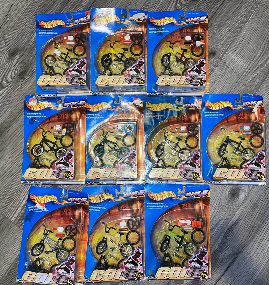 Vintage 2000 Mattel Hot wheels Bike Core Bundle - 10 Total. Troy Lee Series 1/4, 2/4, 3/4, 4/4 (complete series) Track Race Series 1/4, 2/4, 3/4, 4/4 (complete series) Trail Series 1/4 and 3/4 New in package. The boxes were stored so not in pristine condition but still sealed. There is 1 package that had some water damage as shown in picture. Please see photos. Please feel free to check out my other ionones for bumbling discounts