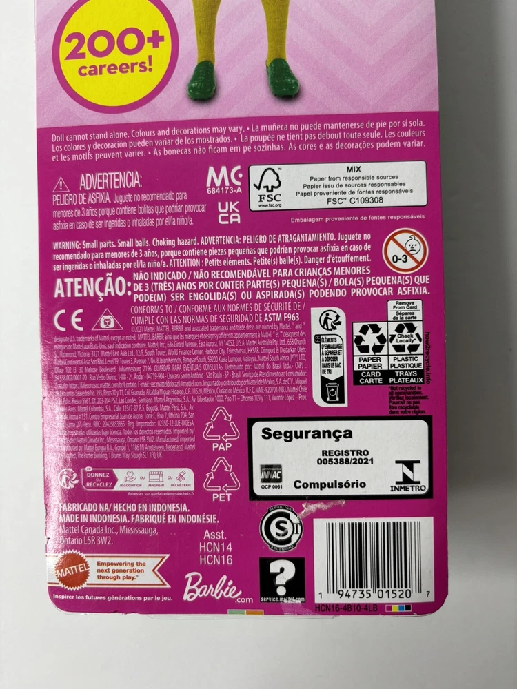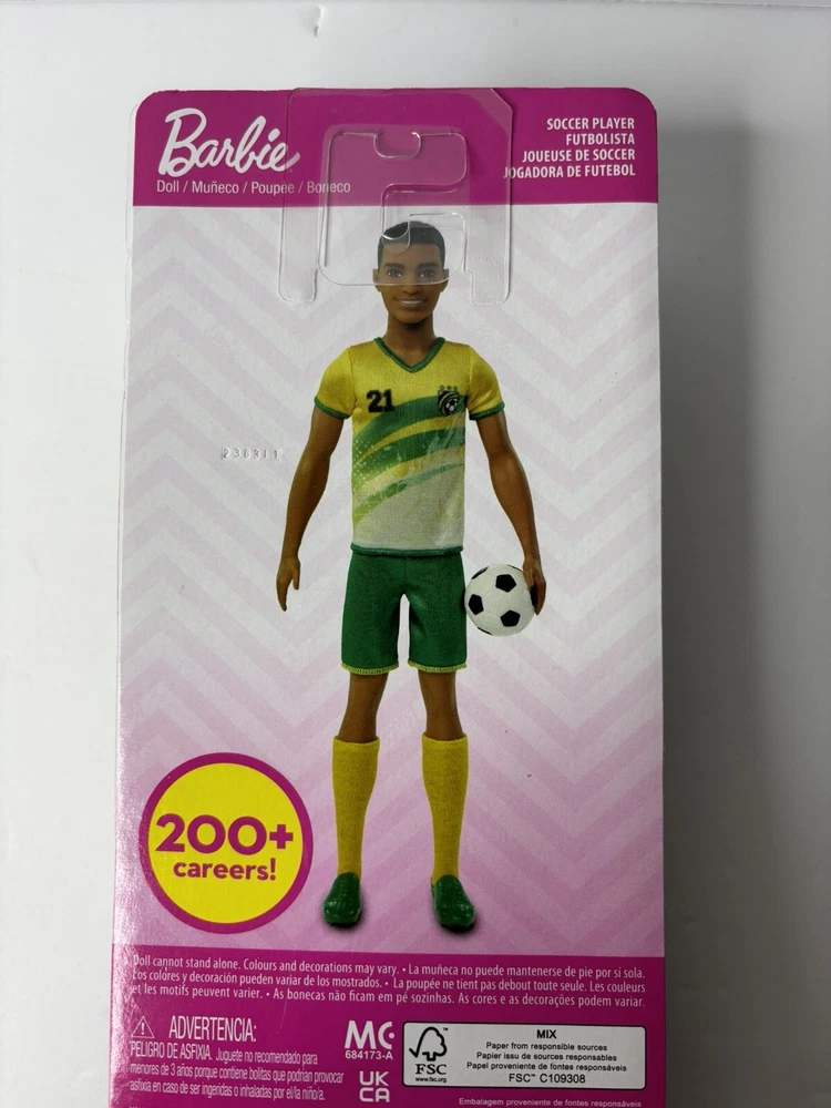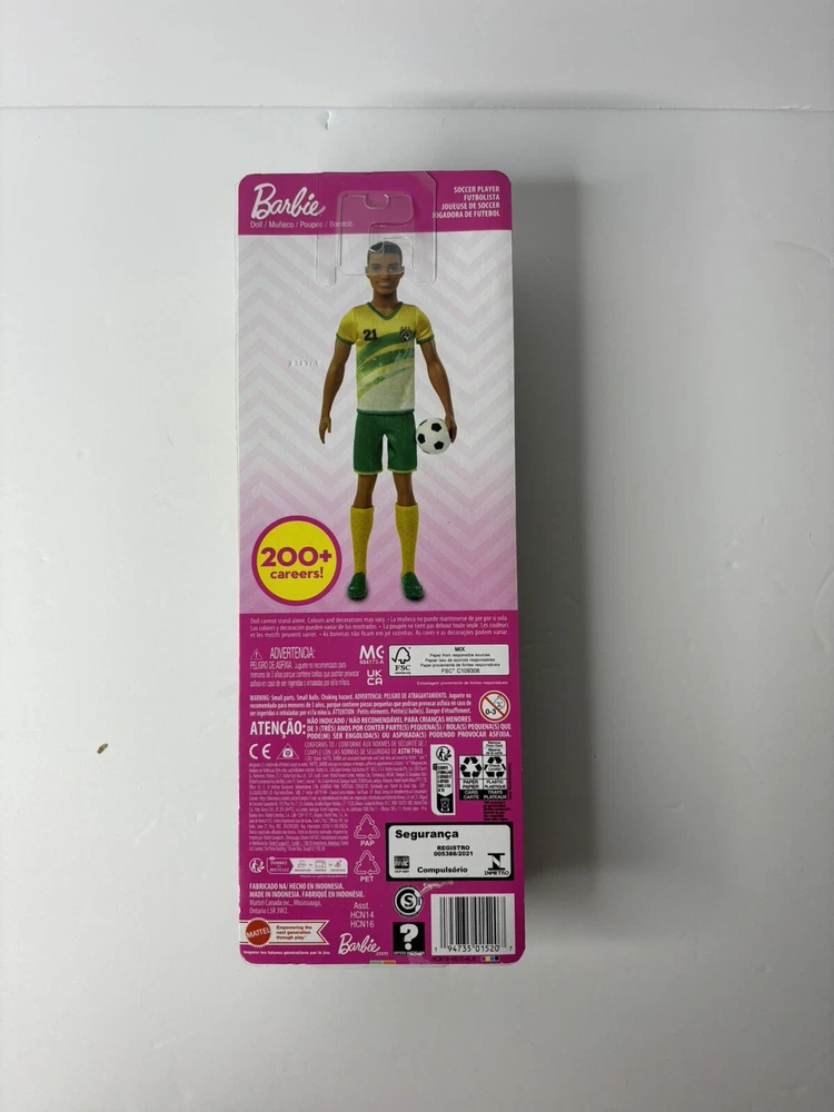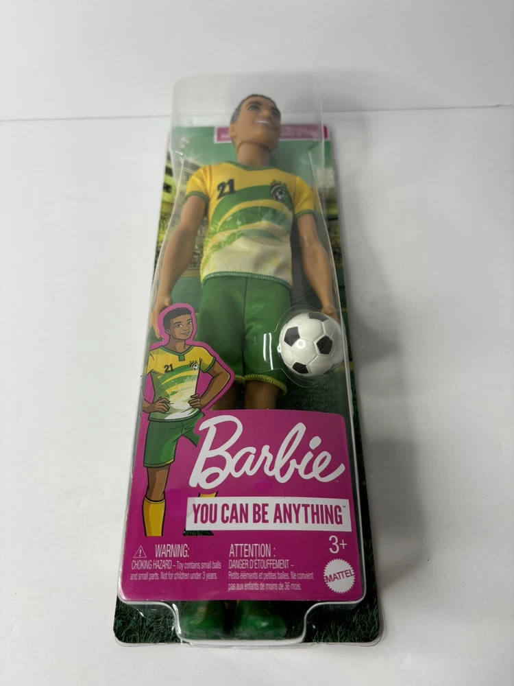 This Mattel 2021 Soccer Player Ken doll is a great addition to any Barbie collection. With its dark brown molded hair and brown eyes, this 12-inch vinyl doll is an original, licensed reproduction from the You Can Be Anything Barbie series. The doll comes in its original packaging, unopened and ready for display. As part of the You Can Be Anything product line, this doll is perfect for collectors and children alike. It features a medium complexion and is an African American ethnicity. The doll is not antique or vintage, but it is a 2021 manufacture from Indonesia. Whether you are a fan of soccer or just love collecting dolls, this Mattel 2021 Soccer Player Ken doll is a must-have.