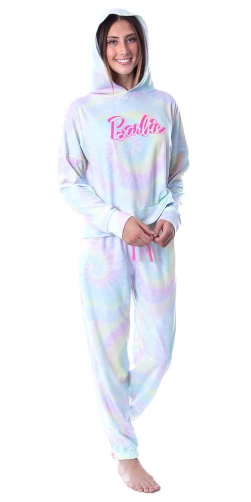 Remember playing with your Barbie doll and Ken doll and all their friends? If you dreamed of the Barbie Dreamhouse and are still a Barbie girl at heart this is the lounge set for you. Featuring the Mattel Barbie Doll logo on front, this hooded jogger has a rainbow tie dye background. The jogger pants feature an extra long waist tie (so you won't lose it in the wash). This hooded jogger set is both comfortable and functional, it is made of a polyester spandex blend that allows it to wear well but also be stretchy and comfortable. The top has a shortened oversized hoodie look with an extra soft hood and the the pants are joggers with two extra deep pockets hidden in the seam to carry your phone or keys. Any fan of Barbie will love relaxing in this fun jogger loungewear set. These are the Mattel Barbie Doll Logo Tie Dye Womens' Pajama Loungewear Hooded Jogger Set SM Remember playing with your Barbie doll and Ken doll and all their friends? If you dreamed of the Barbie Dreamhouse and are still a Barbie girl at heart this is the lounge set for you. Featuring the Mattel Barbie Doll logo on front, this hooded jogger has a rainbow tie dye background. The jogger pants feature an extra long waist tie (so you won't lose it in the wash). This hooded jogger set is both comfortable and functional, it is made of a polyester spandex blend that allows it to wear well but also be stretchy and comfortable. The top has a shortened oversized hoodie look with an extra soft hood and the the pants are joggers with two extra deep pockets hidden in the seam to carry your phone or keys. Any fan of Barbie will love relaxing in this fun jogger loungewear set. These are the best! Product Details Color Mulitcolor Size Small Brand Intimo Feature THIS LOUNG SET IS BARBIE MERCHANDISE - Intimo specializes in nice, apparel, sleepwear and underwear for men, women, boys, and girls. Whether you are looking for the latest in movies, books, games or videogames or your favorite classic characters look no further than INTIMO