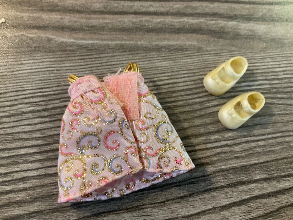 Kelly Doll Outfit This Kelly Clothes Set features A sleeveless pale pink dress with gold straps, gold glitter polka dots at top, and gold glitter accented swirls on the lower part of the dress A pair of shoes are included Set is in Nice Condition ***Please don’t hesitate to make an offer! *** ***Buy It Now :$ 4.50*** OR Best Offer ***Shipping: $ 4.75*** ***Happy to combine shipping for you*** *** Please let me know if you have any question, Happy to help in any way I Can*** ****Please , if you have the time check out my newly opened eBay store. I will be listing many Barbies, clothing, & accessories. As rims goes on I hope to add more fun collectible and vintage items. Like my store to see my newly listed items. Thanks so much!