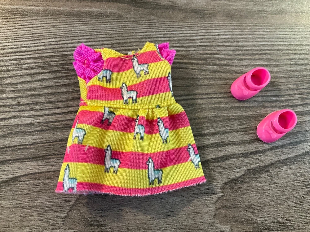 Kelly Doll Outfit This Kelly Clothes Set features A sleeveless pink and yellow striped dress with llama print on both sides A pair of shoes are included Set is in Nice Condition ***Please don’t hesitate to make an offer! *** ***Buy It Now :$ 4.50*** OR Best Offer ***Shipping: $ 4.75*** ***Happy to combine shipping for you*** *** Please let me know if you have any question, Happy to help in any way I Can*** ****Please , if you have the time check out my newly opened eBay store. I will be listing many Barbies, clothing, & accessories. As rims goes on I hope to add more fun collectible and vintage items. Like my store to see my newly listed items. Thanks so much!