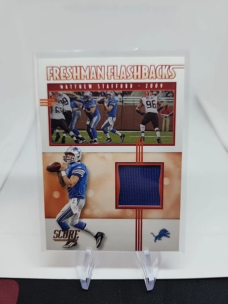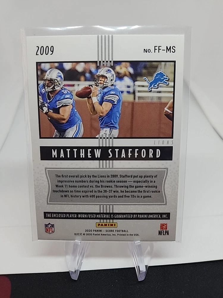 This is a Matthew Stafford 2020 Score Freshman Flashbacks Jersey trading card featuring the Detroit Lions player. The card measures 3½" x 2½" and is an original, not a licensed reprint. It is part of the Score Freshman Flashbacks Jersey set and has the card number FF-MS. The card showcases Stafford's character and does not include an autograph. It is a perfect addition to any football fan's collection.