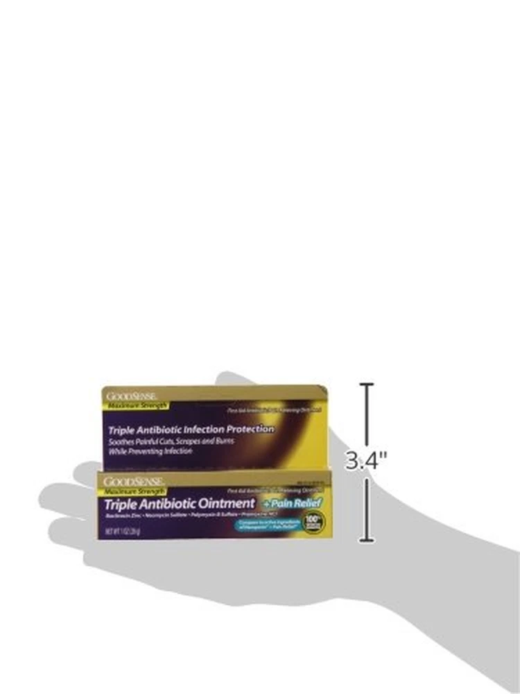 ACTIVE INGREDIENTS: Compare to the active ingredients in Neosporin + Pain Relief OINTMENT CONTAINS: Bacitracin Zinc, Neomycin Sulfate, Polymyxin B Sulfate, Pramoxine HCl DIRECTIONS: adults and children 2 years of age and older: Clean the affected area and apply a small amount (an amount equal to the surface area of the tip of a finger) of GoodSense Triple Antibiotic Ointment on the area 1 to 3 times daily. May be covered with a sterile bandage. Children under 2 years of age: ask a doctor. INJURY: It is a general term that refers to harm caused by accidents, falls, hits, weapons, and more. Injuries can happen at work or play, indoors or outdoors. MAXIMUM STRENGTH: antibiotic ointment that helps prevent infection and relieves pain in minor Cuts, Scrapes and Burns Compare to Neosporin® + Pain Relief active ingredients. First Aid Antibiotic Pain Relieving Ointment active ingredients are bacitracin zinc, first aid antibiotic; neomycin sulfate, first aid antibiotic; polymyxin B sulfate, first aid antibiotic; and pramoxine HCl, external analgesic. Soothes painful cuts, scrapes, and burns. Triple antibiotic infection protection. Helps skin heal to look healthy.