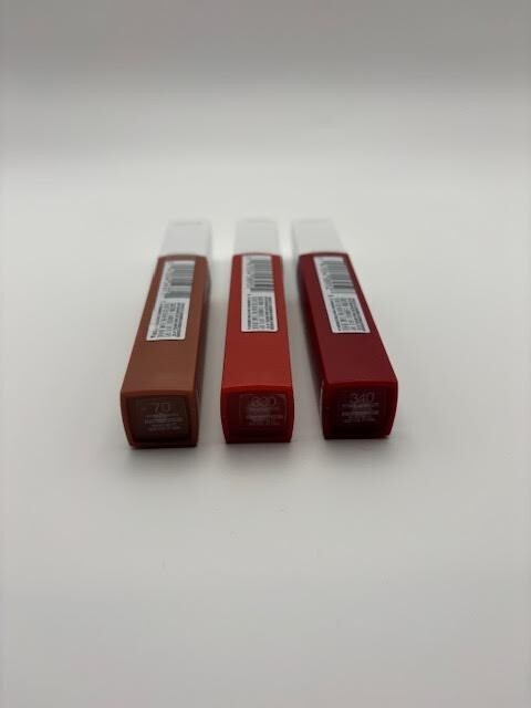 3 PACK!! Maybelline Super Stay Matte Ink Lipstick **SEALED** Assorted 1x 70 Amazonian (041554543711) 1x 330 Innovator (041554589504) 1x 340 Exhilarator (041554589528) Up to 16 hours of saturated liquid matte Highly-pigmented color Long-lasting, saturated matte Maybelline Matte Ink Liquid Lipstick is available in a range of intense saturated shades For easy removal, use with Maybelline's SuperStay Eraser lipstick remover.