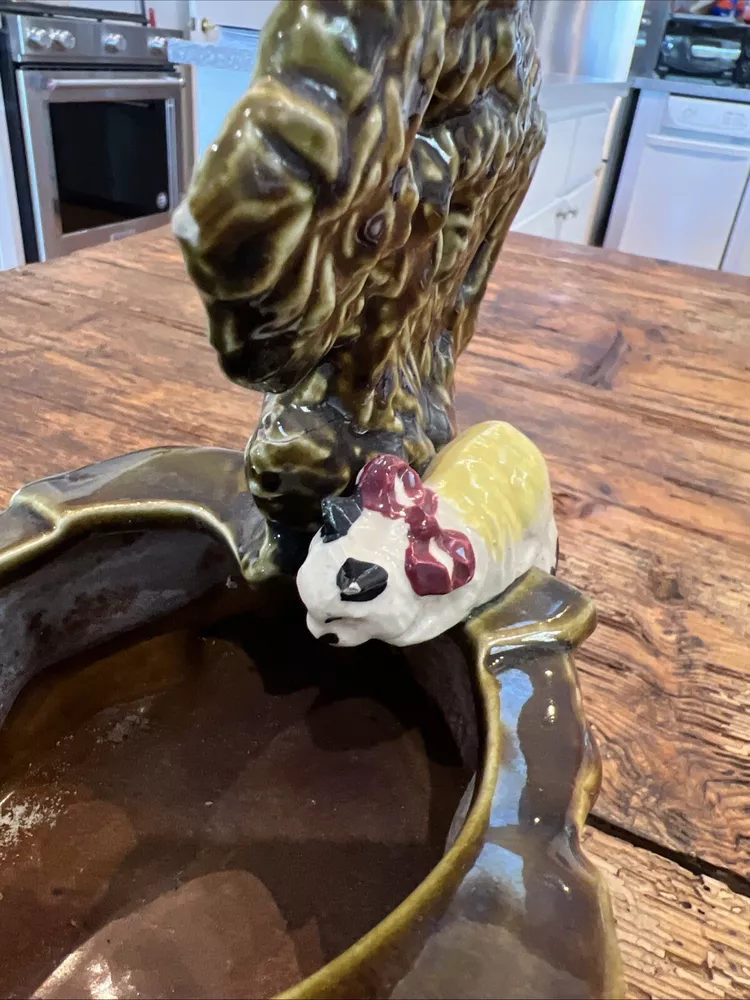 Add a touch of vintage charm to your cat-themed collection with this McCoy Pottery Cat By The Well Planter. Featuring the Cat At The Well pattern, this art pottery piece is a beautiful addition to any home decor. Made of high-quality clay material, this planter is sturdy and durable, perfect for housing your favorite indoor plants. With a production style of art pottery and a production technique of pottery, this planter was manufactured in the United States in 1957. Measuring at 8 1/2" in length, 7" in height, and 4 3/4" in width, it's the perfect size for any space. Don't miss out on the opportunity to own this unique piece of history. This looks great but does have a repaired break in the tree branch and one cat ear is rough on the tip.