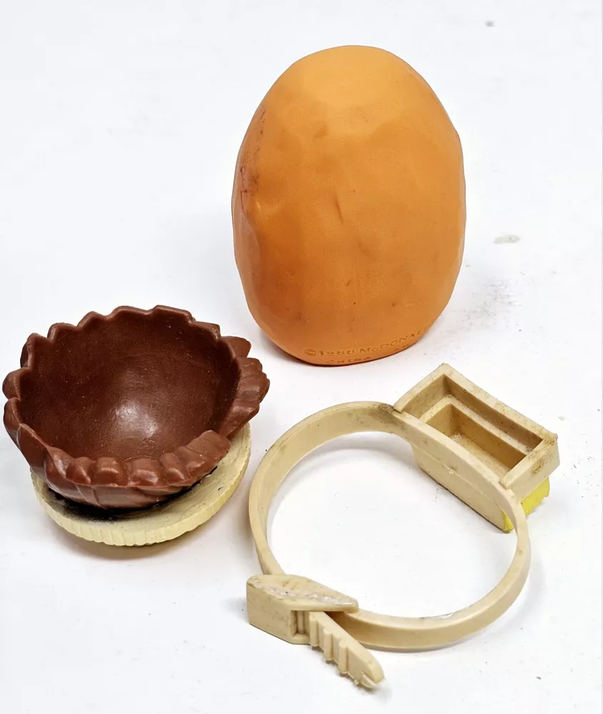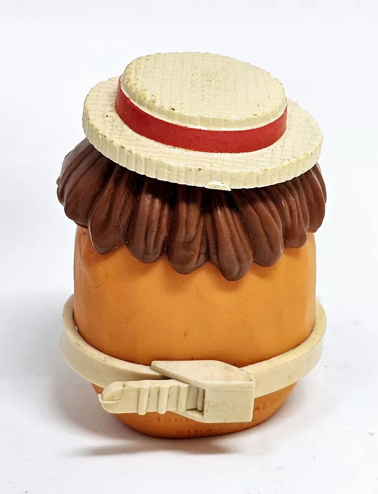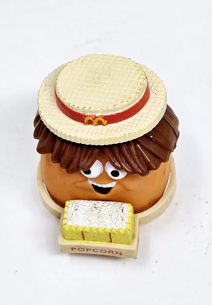 This is a vintage McDonald's Chicken McNugget Buddies toy from 1988, featuring the character Corny who is a popcorn vendor. This collectible item was part of a Happy Meal promotion in China and is a sought-after piece for fans of McDonald's memorabilia and Fast Food & Cereal Premiums.
