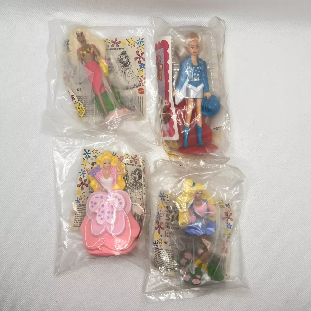 Vintage 1990’s McDonald's Barbie Happy Meal Toy Lot of 4 NOS. Mixed lot in package. Their is slight wear the packing bag; shown in photos! They make great cake toppers! Thank you for stopping by!
