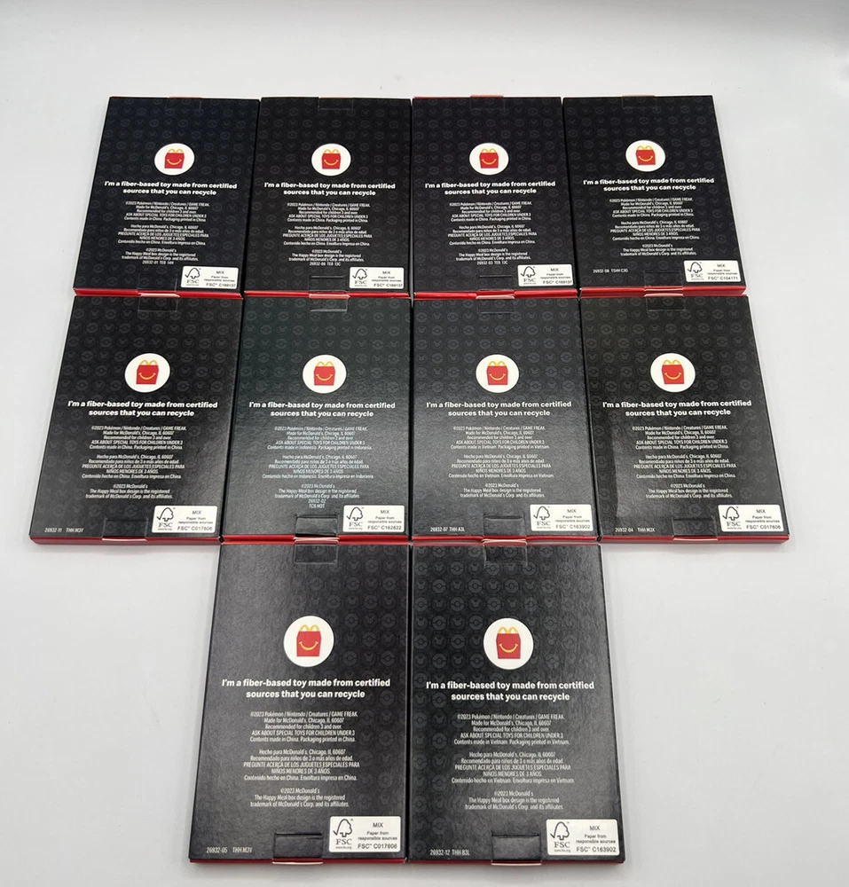 Experience the excitement of collecting the full set of 10 McDonald's Pokemon toys from the 2023 Happy Meal promotion. Each toy features a beloved character from the popular franchise and is still unopened, waiting for its new owner to reveal its unique design. These toys are perfect for fans of all ages, from children to adults, and make a great addition to any collection. The McDonald's Pokemon 2023 Happy Meal promotion offers toys of various characters, including Pikachu and Eevee, and is sure to delight fans of the franchise. Each toy is brand new and unopened, making it a great gift for any Pokemon lover. Don't miss your chance to collect the full set and add these fun toys to your collection today! Each Comes with Sealed Booster Pack (4 Cards), Cardboard Coin, and Sticker Sheet We will ship out in a box 📦, not a bubble mailer for extra protection