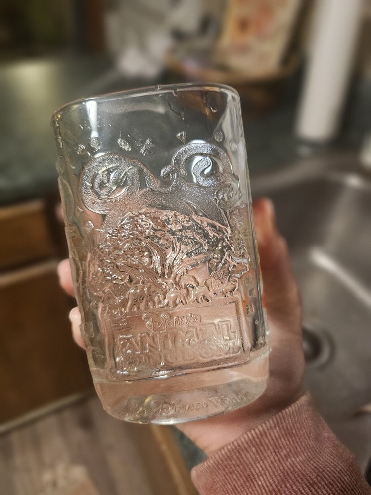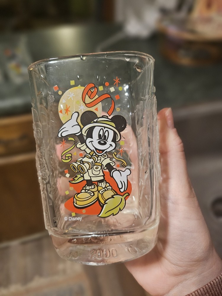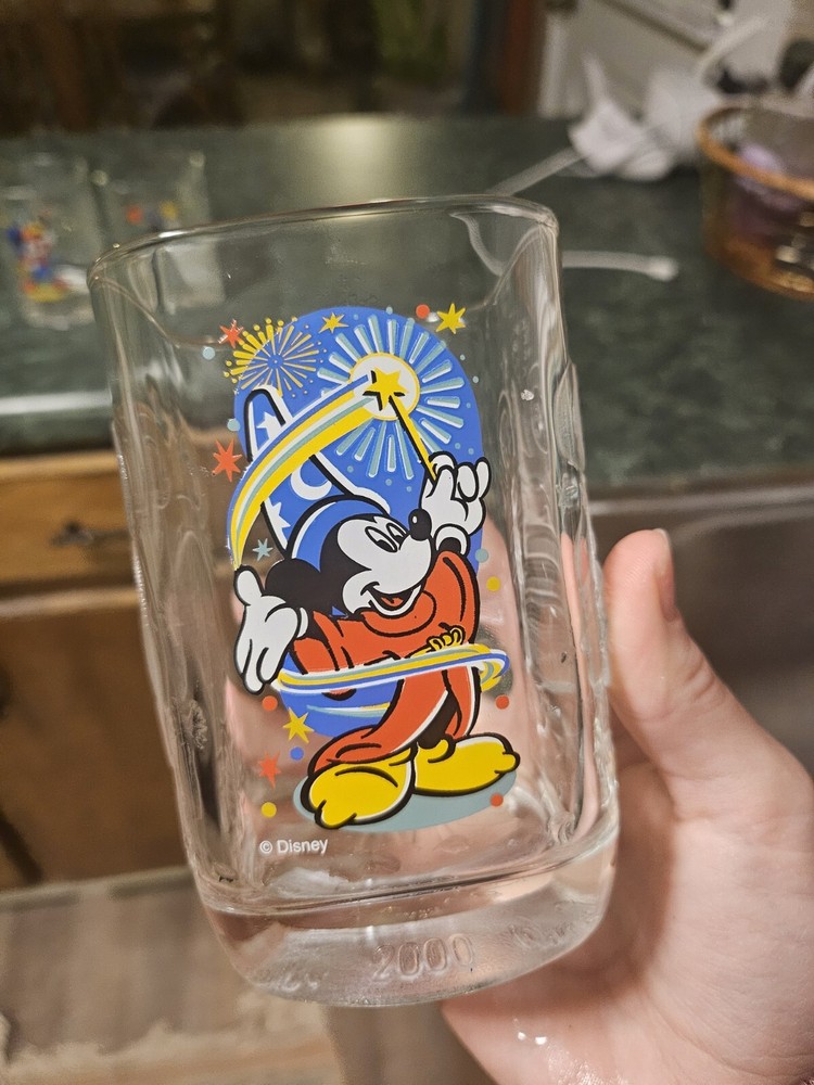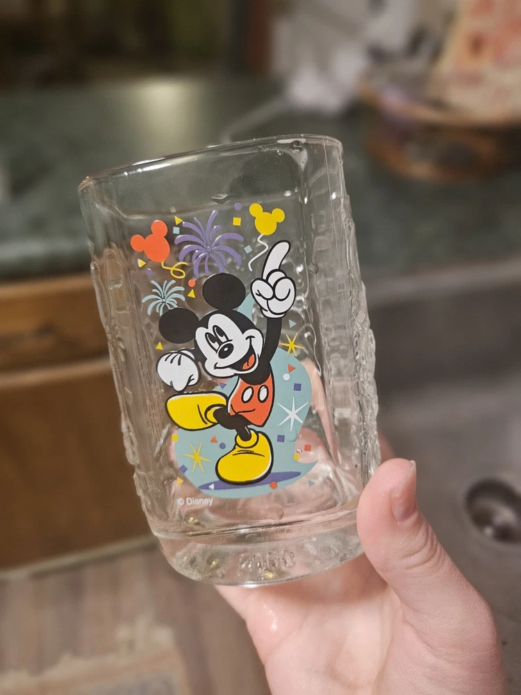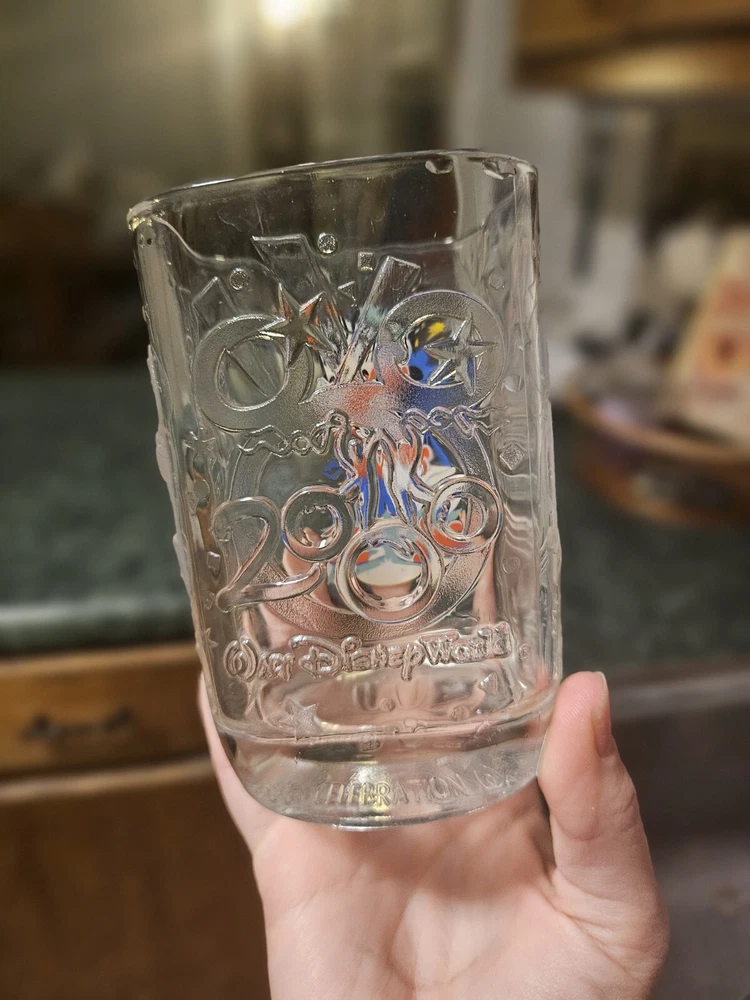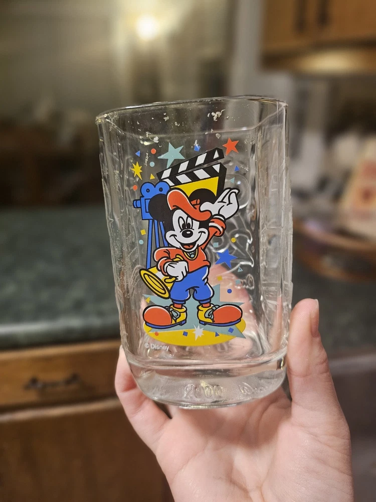 The product is a set of six glass tumblers featuring designs from the Walt Disney World 2000 Millennium Celebration, a collaboration between McDonald's and Disney. In excellent condition! Made of glass, these collectible tumblers are a nostalgic piece for fans of Disney and those who attended the Millennium Celebration at Walt Disney World in 2000. Each glass cybolizes one of the 4 parks, with two duplicate parks to make a total of 6 glasses.