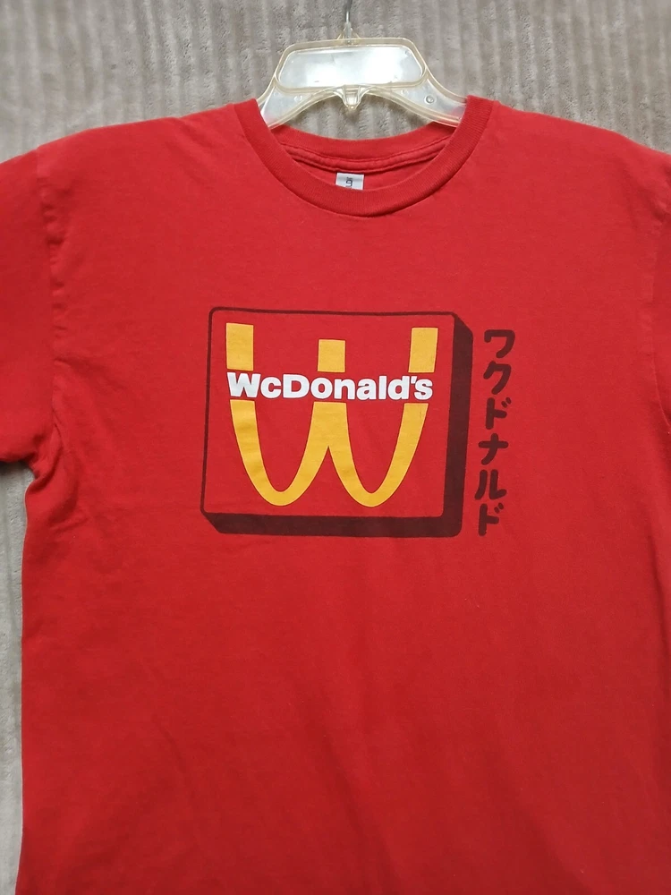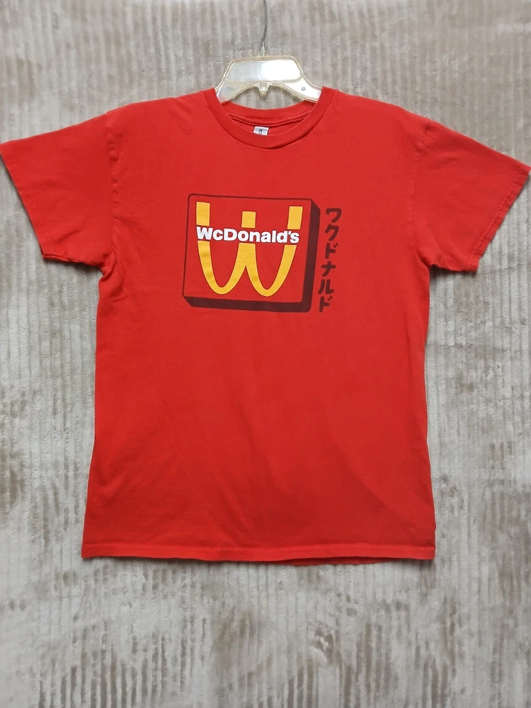 This McDonald's WcDonalds T-Shirt is a must-have for any fan of anime and funny fashion. Made of comfortable, machine-washable cotton knit fabric, this red shirt features a graphic print with the iconic WcDonald's logo and a crew neckline. The short-sleeved shirt is perfect for all seasons, with easy care, preshrunk, packable, non-iron features that make it a convenient addition to your wardrobe. The shirt is available in size medium and is suitable for both men and women. The T-shirt is perfect for casual wear or as a gift for a loved one.