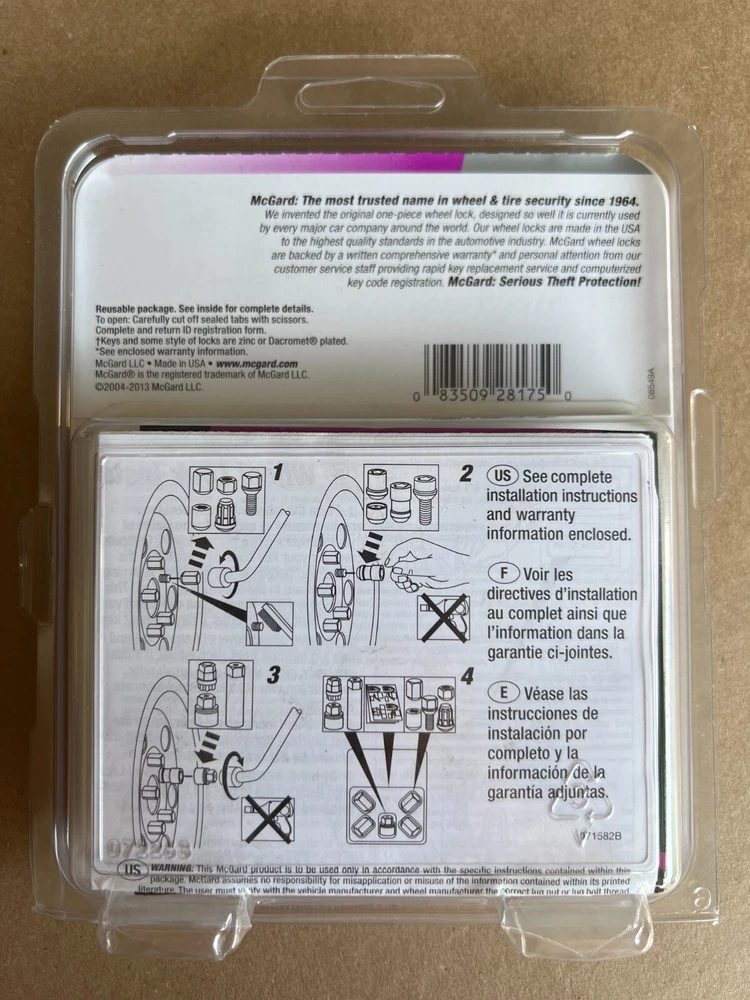 McGard 28175 Chrome Bolt Style Radius Seat Lock Bolt Set (M12 x 1.5) Secure your wheels with confidence using the McGard 28175 Chrome Bolt Style Radius Seat Lock Bolt Set. Expertly engineered by McGard, a trusted name in automotive security, this set provides superior protection against wheel theft while enhancing your vehicle's aesthetic appeal. Key Features: Premium Quality Construction: Manufactured by McGard, ensuring durability and long-lasting performance. Secure Fit: Designed with M12 x 1.5 threads, these lock bolts offer a precise and secure installation on compatible wheels. Sleek Chrome Finish: The polished chrome finish not only delivers a refined, eye-catching look but also provides excellent resistance to corrosion. Bolt Style Design: Features a bolt style with a radius seat that enhances the locking mechanism, making unauthorized removal significantly more difficult. Enhanced Wheel Security: Engineered to safeguard your wheels against theft while maintaining a clean and stylish appearance. Upgrade your vehicle's security and style with the McGard 28175 Chrome Bolt Style Radius Seat Lock Bolt Set. Add this essential upgrade to your cart today and drive with peace of mind, knowing your wheels are protected by quality you can trust! Feel free to contact us with any questions or request additional photos. Thank you for considering our listing, and happy bidding!