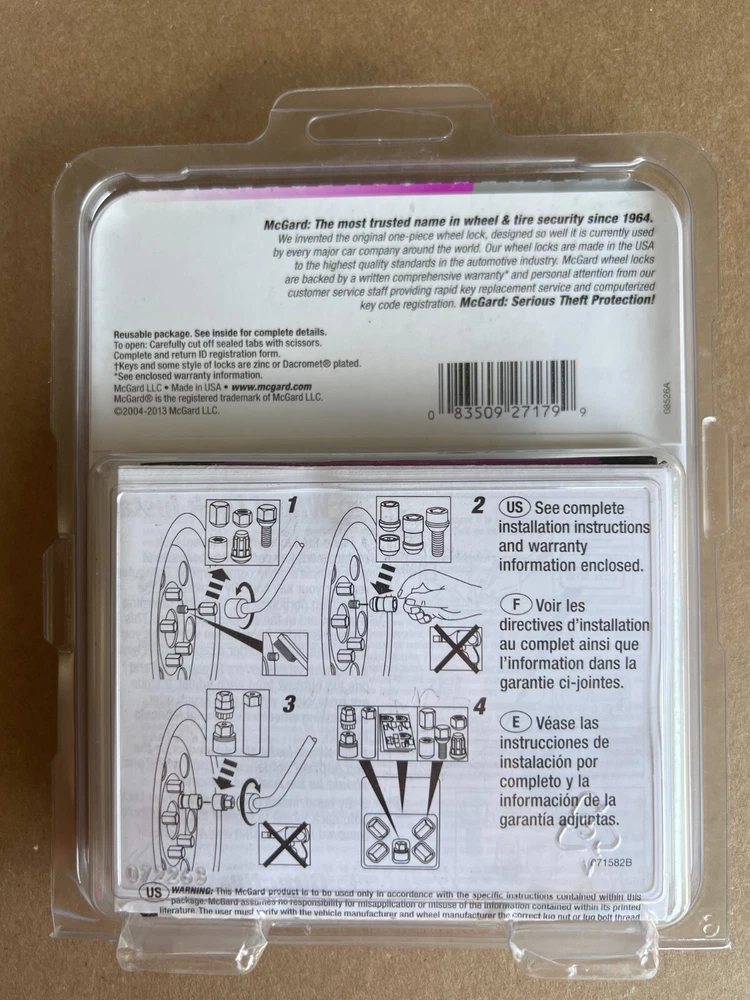 McGard 27179 Chrome Bolt Style Cone Seat Wheel Locks – Set of 4 (M12 x 1.5) Upgrade your vehicle’s security and style with the McGard 27179 Chrome Bolt Style Cone Seat Wheel Locks. Crafted by McGard, a trusted leader in automotive security, these high-quality wheel locks are designed to deter theft while adding a polished, sophisticated look to your ride. Key Features: Premium Construction: Manufactured by McGard to deliver long-lasting durability and reliable performance. Secure Fit: Engineered for wheels with M12 x 1.5 threads, ensuring a perfect and secure installation. Bolt Style Cone Seat Design: Combines the robust bolt style with a cone seat for enhanced security, making unauthorized removal extremely difficult. Sleek Chrome Finish: Provides an attractive, high-gloss look that complements any vehicle, while also resisting corrosion and wear. Complete Set: Includes 4 wheel locks, offering full protection for your vehicle’s wheels. Why Choose McGard 27179 Wheel Locks? Enhanced Security: The unique design is specifically engineered to protect your wheels against theft. Easy Installation: A straightforward upgrade from your standard wheel nuts for a quick, hassle-free installation. Stylish Addition: The refined chrome finish and modern design not only secure your wheels but also elevate your vehicle’s appearance. Protect your investment and drive with confidence. Add the McGard 27179 Chrome Bolt Style Cone Seat Wheel Locks to your cart today! If you have any questions or need additional photos, please feel free to contact us. Thank you for considering our listing, and happy bidding!