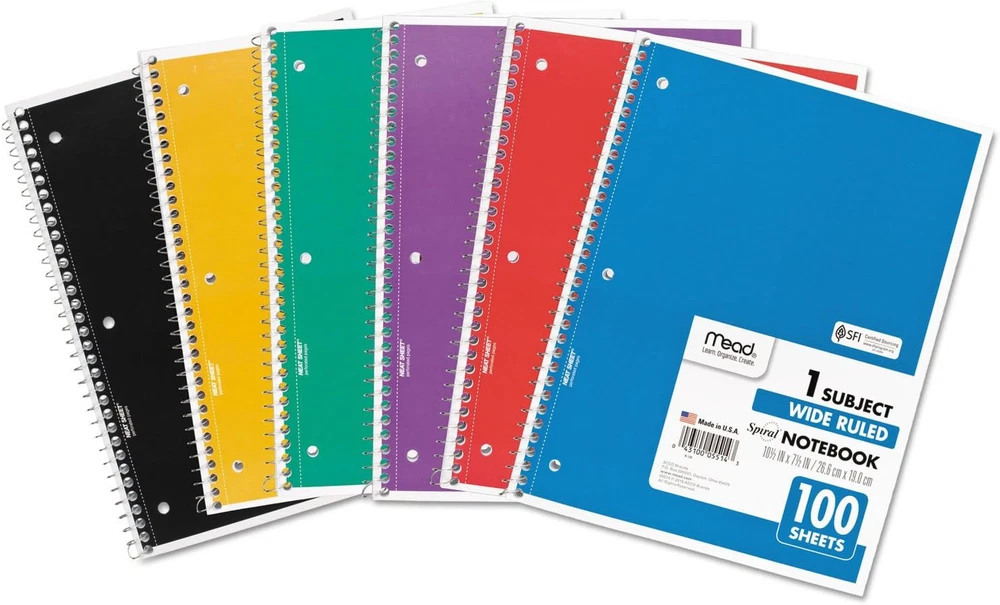 Mead Spiral Notebook,1-Subject,Wide Rule, 8 x 10-1/2, 100 Sheets (1 Pack) Spiral binding for smooth page turning. Double-sided, ruled paper. Durable, coated paper cover. 3-hole punched to store in your favorite binder. Great for color coding by subject. Notebook spiral binding will not snag and resists uncoiling to keep your notes together. One-Subject Format—Three-hole punched. Pocket-Sized Indicator: N; Book-Binding Type: Spiral Coil; Book-Binding Edge: Side; Cover Color: Randomly Assorted. About this item Perfect to use for 1 subject, this spiral notebook comes in handy for your favorite class or any project With 100 wide ruled, double-sided sheets, there’s plenty of notetaking space. Pages are perforated so they easily tear out with clean edges. Notebook is 3-hole punched for storage in your favorite binder. This allows you to keep all your work organized and in one place. Spiral binding will not snag and resists uncoiling to keep your notes together. Notebook covers are coated for durability. Sheets measure 10-1/2" x 7-1/2" when torn out. Overall size of 10-1/2" x 8". Available in assorted colors: Red, Blue, Green, Yellow, Purple, Black. Please note: color choice is not available for this item, color shipped to you is selected at random, and will vary.