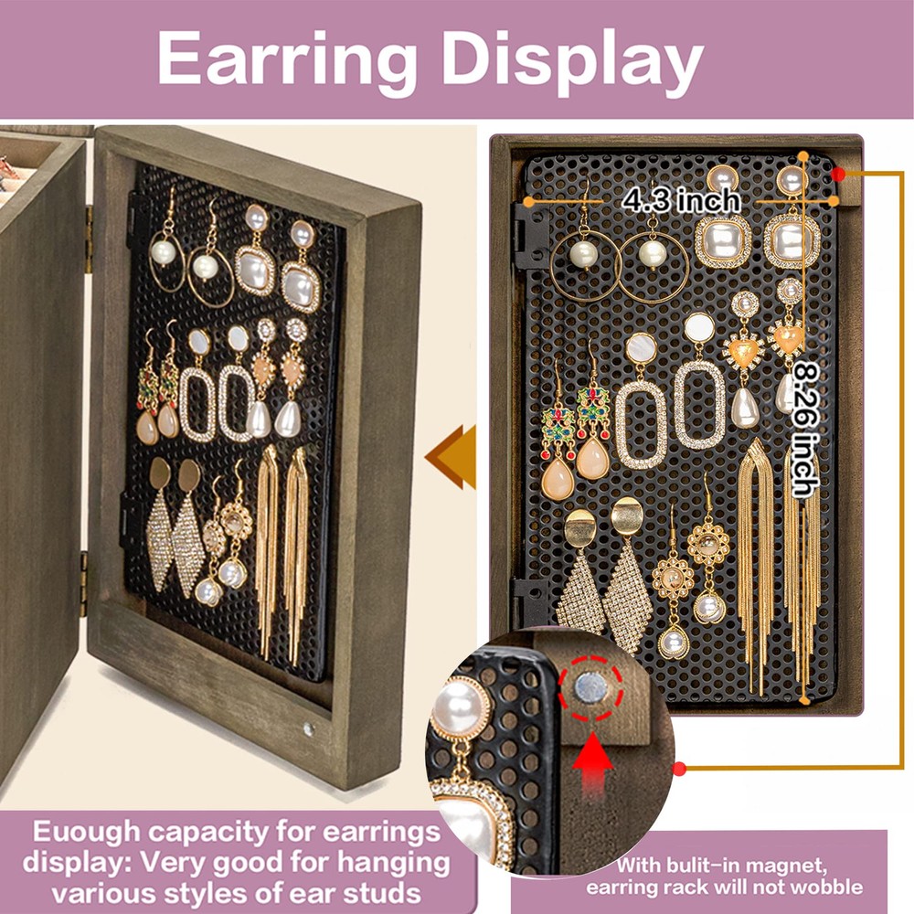 ❤Elegant Jewelry Box: Is your growing jewelry collection cluttering up on your dresser? The jewelry box designed with 5 tiers and 2 side doors. When it close, it will not take up much space, when it open, you will be surprised by its capacity, it is a pretty practical and charming addition to your home. ❤Large Capacity: The top layer has a built-in mirror and ring tray, 4 pull-out drawers keep your jewelry away from getting messed up, easily store different sizes of jewelry, even necklaces, bangles, and big earrings like hooped earrings. 2 side doors for hanging chunky necklaces and plenty pairs of earrings. ❤Natural Solid Wood: Made of rustic quality wood, sturdy and durable to stand heavy jewelry. Linen cloth-covered inside keeps your jewelry well against dust, scratches, damages. Metal delicate handle highlights retro beauty. The large wooden jewelry box can last for years. ❤Ideal Gift for Loved One: Whoever your Loved one's Mom, Wife, Daughter, or Girlfriend, the jewelry box is even also perfect as a housewarming present, and an anniversary gift, we can be sure this will be the most practical and memorable gift they have ever received. ❤ SATISFACTION SERVICE: The jewelry organizer box size: 8.26″L x 6.29″W x 10.62″H. Like it or get money back, we are committed to the highest levels of quality and excellence and stand behind every product we make, we’ll happily resolve the matter.