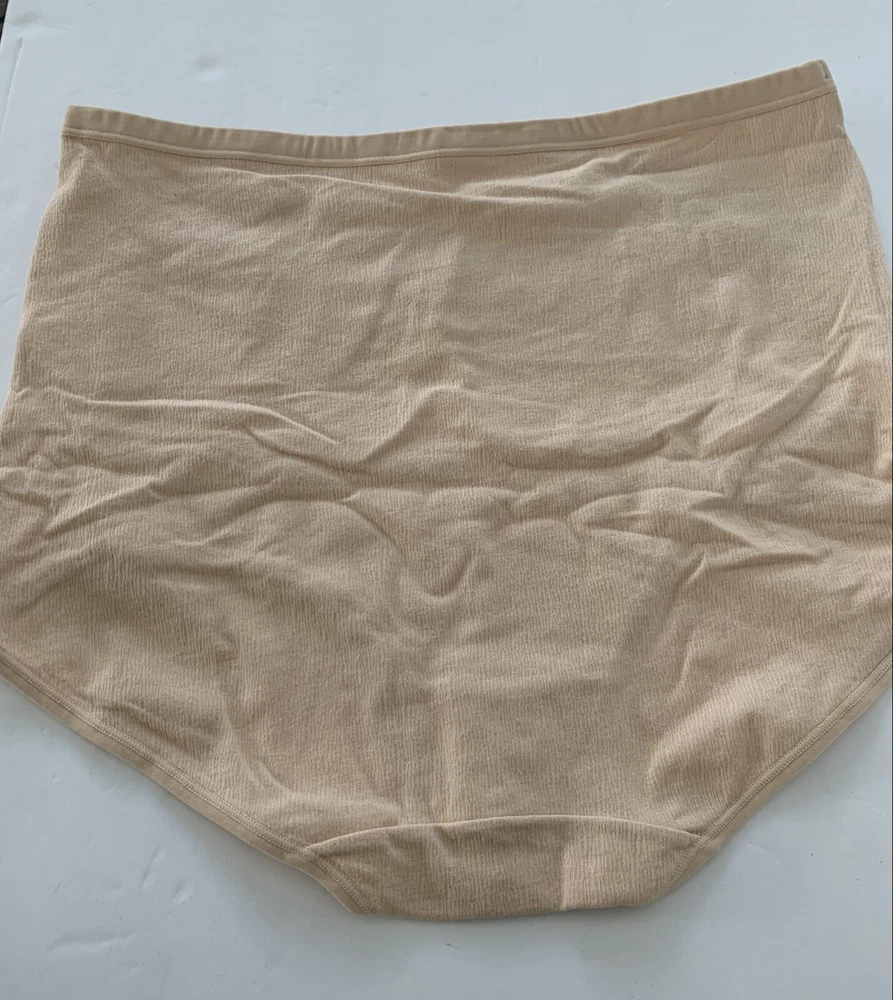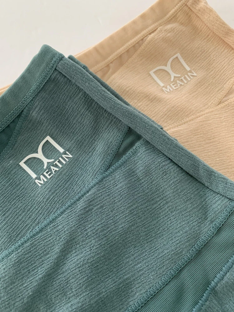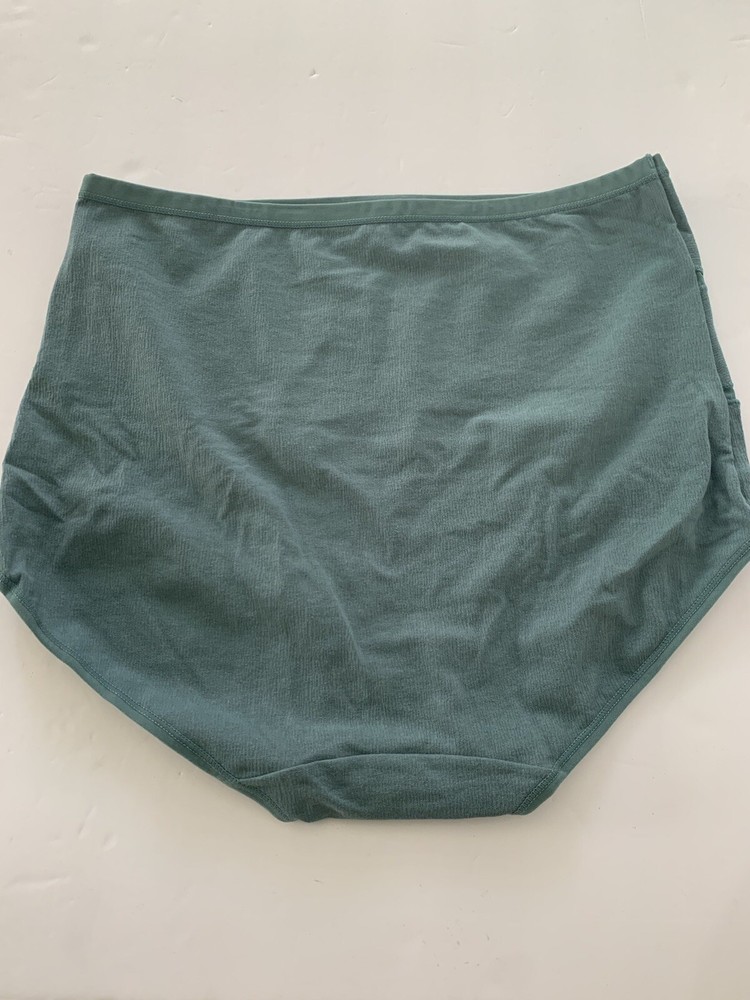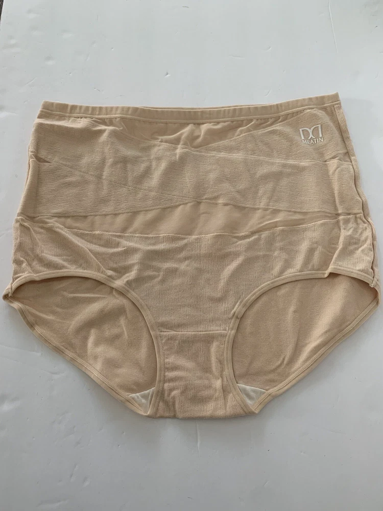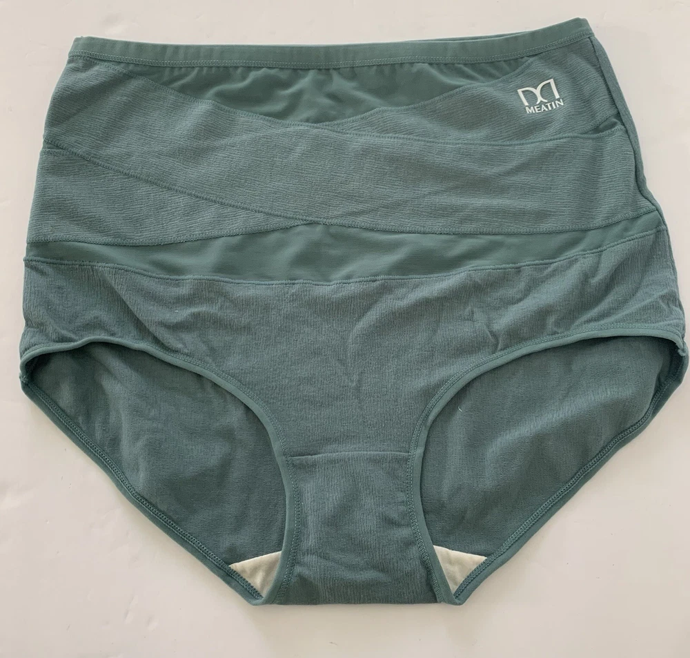 The product is of two pairs of Meatin Women's Underwear Briefs in size 2XL. One pair is teal in color and the other is beige. The briefs are made from a blended fabric of polyester and cotton, making them lightweight, stretchy, and breathable. They feature a logo accent, high rise, and are tagless for added comfort. This plus-size underwear set is perfect for women looking for quality intimates in solid colors with a focus on comfort and style.