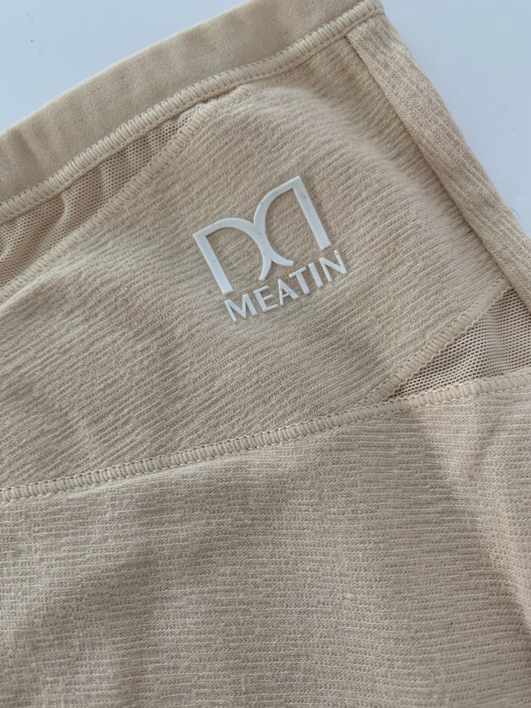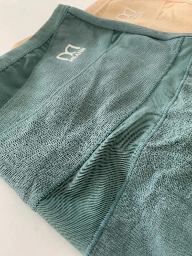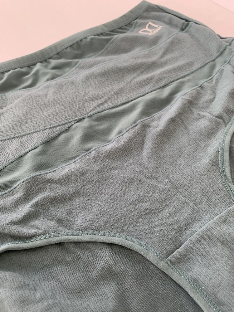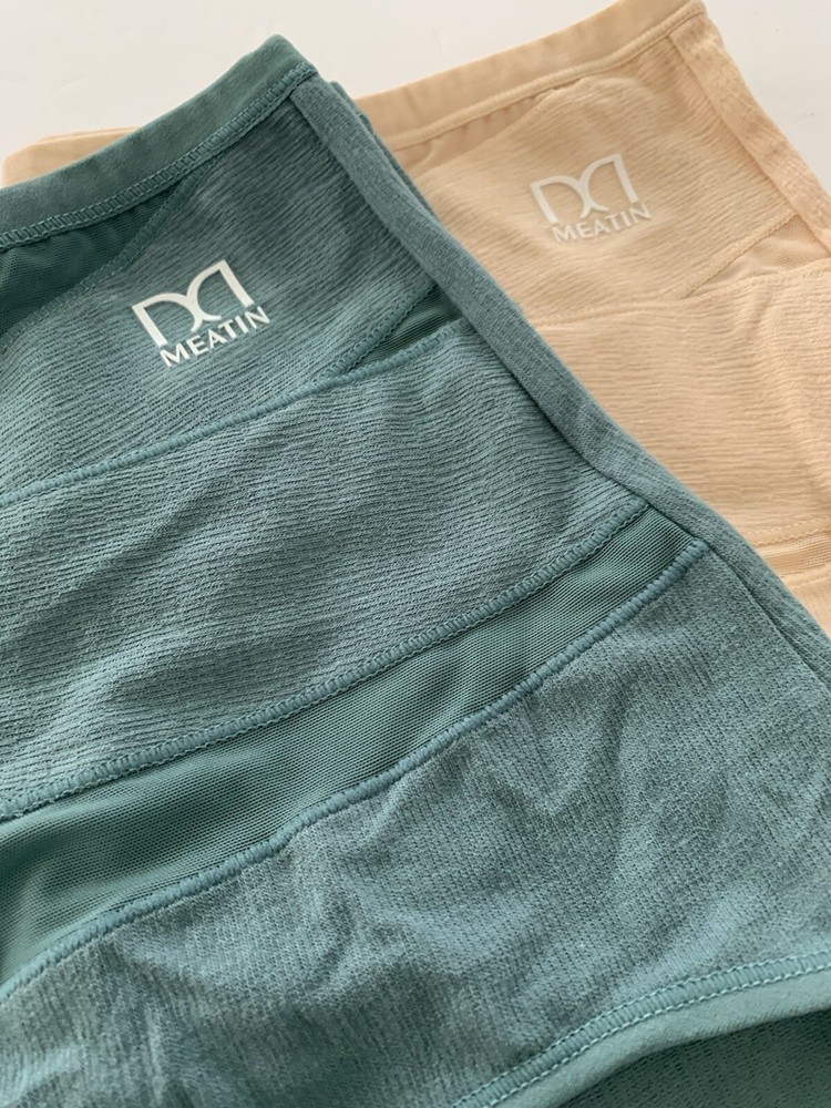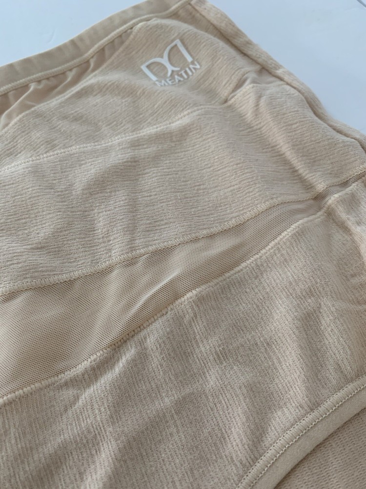 The product is of two pairs of Meatin Women's Underwear Briefs in size 2XL. One pair is teal in color and the other is beige. The briefs are made from a blended fabric of polyester and cotton, making them lightweight, stretchy, and breathable. They feature a logo accent, high rise, and are tagless for added comfort. This plus-size underwear set is perfect for women looking for quality intimates in solid colors with a focus on comfort and style.