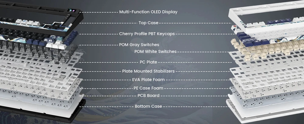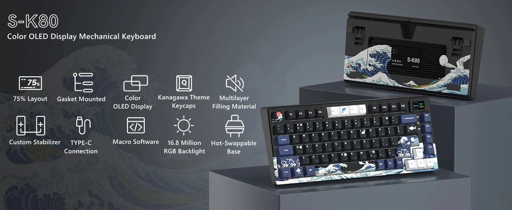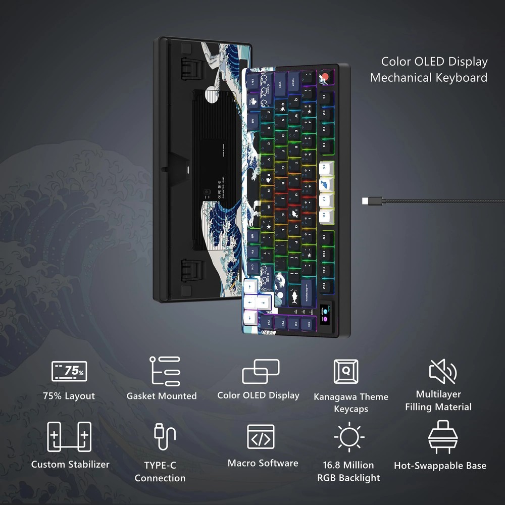 Specifications: Total Keys: 81 Keys Material: PC Plastic Keycaps: Dye Sublimation PBT Pudding Keycaps Feature: OLED Screen Keyboard Keyboard Layout: US ANSI 75% Layout Mounting Style: Gasket Mounted Keycap Printing Method: Dye Sublimation Keycap Profile: ASA profile (Raindrop)/Cherry Profile (Kanagawa) Connection Type: Wired Interface: USB Type-C Compatible Operating Systems: Windows/macOS Hot-Swap: Support Weight: 900g Including: Keyboard*1 Keycap Puller*1 Switches Puller*1 Manual*1 Pay attention to: 1. Please allow a little size error due to manual measurement. 2. Please be reminded that due to lighting effects and monitor's brightness / contrast settings etc.The color tone of the website's photo and the actual item may be slightly different. 3. Because we send too many packages, if some buttons lost or damaged on the way, please leave Send us a message and we will send the lost or damaged buttons to you as soon as possible. Don't worry, don't leave feedback immediately.